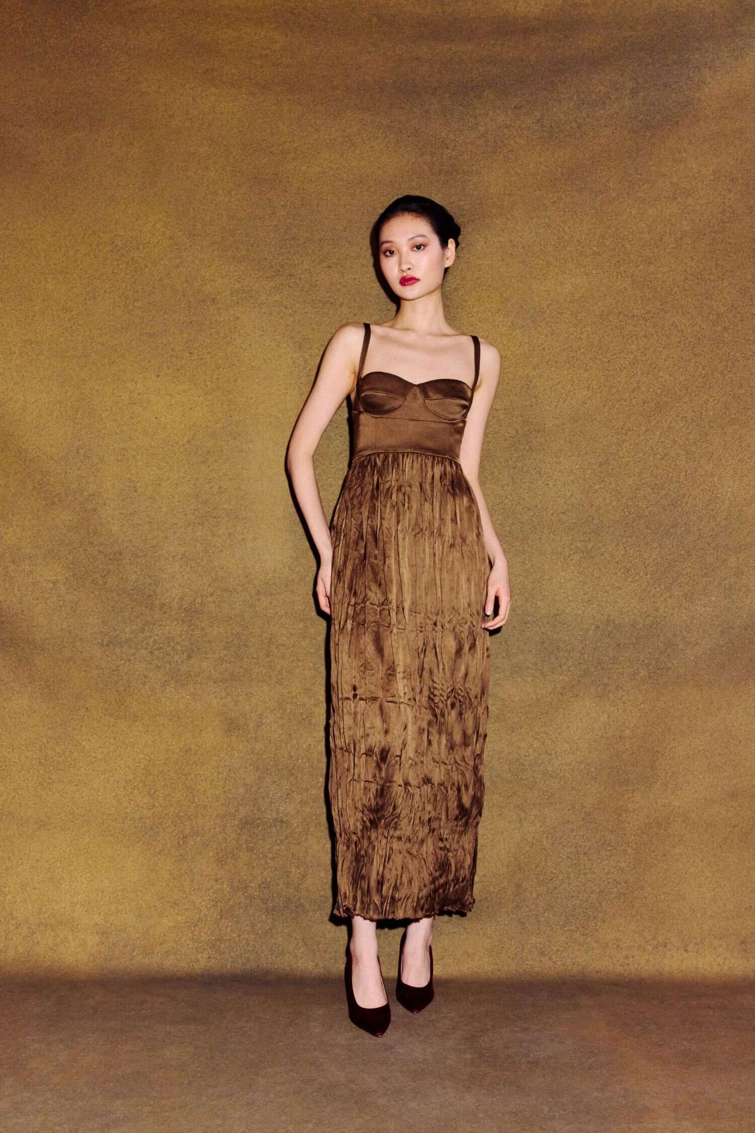 Brown is just a color. But for evening? That’s a statement! Years ago, I heard someone say that “brown equals markdown” in fashion because it never sells well at retail. But is that still the case? Ralph Lauren certainly made compelling argument for head-to-toe brown day or night and it’s hard to imagine anyone turning up their nose at Monique Lhuillier’s liquid velvet long sleeve turtleneck gown in deepest chocolate brown.