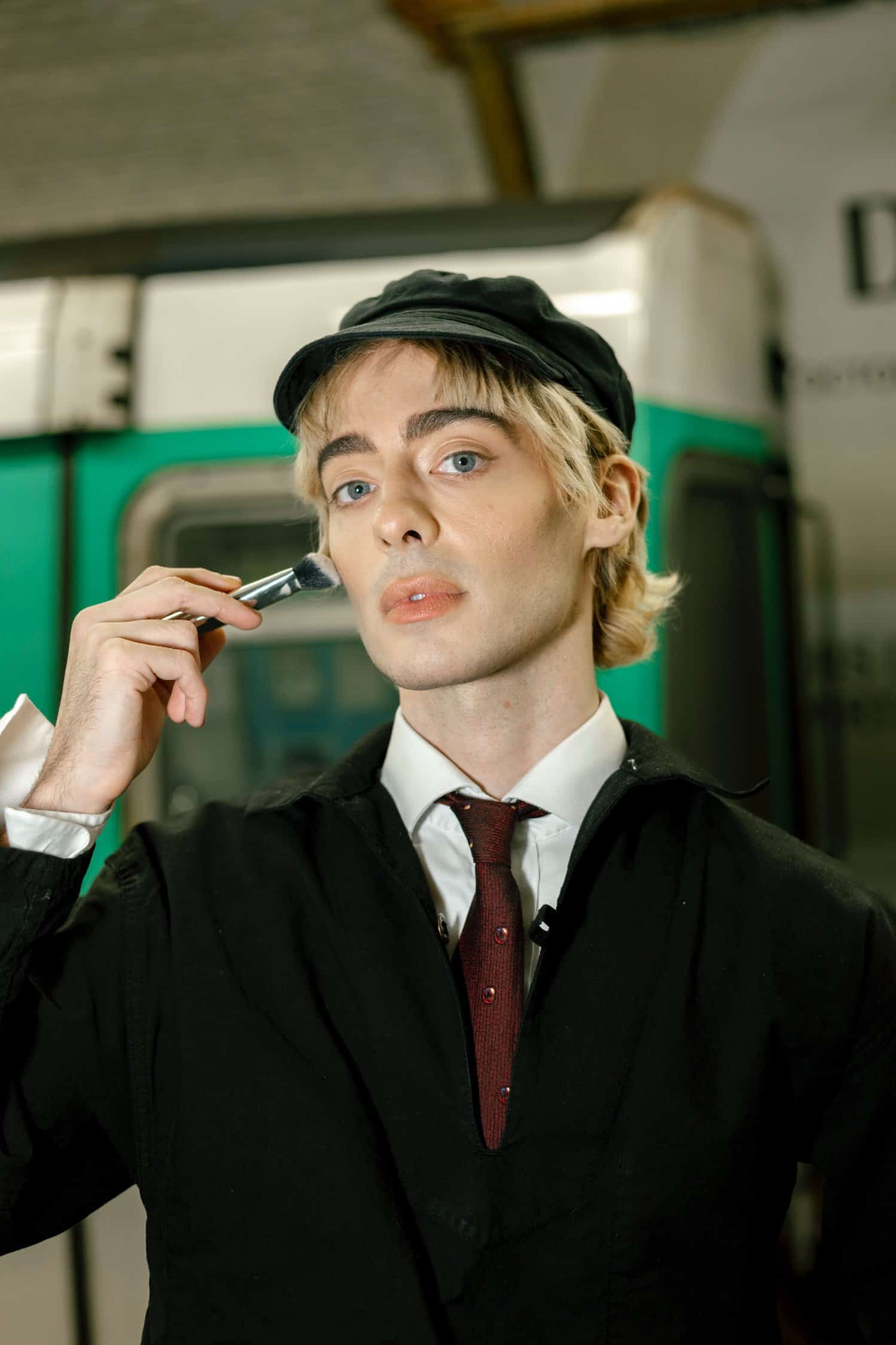 I always wore makeup when I was making videos, but it’s something I didn’t necessarily show. I would do it as incognito makeup, just getting camera ready. As I was entering the beauty space, I found it very monotonous—it was a lot of the same content in the same format. The multiple layers for me is, I’ve always had social anxiety, and battling with that has always been a challenge. This really threw me out into hot water, like, “What’s the thing I want to do least right now? Go into the middle of the street and put on makeup.” I thought, not only would it help me evolve personally, but it would shake things up and inspire people. Normalizing makeup for men is another aspect of it—that’s why I started doing “Get Ready With Me” videos for the office. That’s why I chose the metros, the tubes—”subways,” as you would say in New York!—and London Bridge, Piccadilly Circus. I put myself in a suit, and it was like, “get ready with me for work,” because I wanted it to be as if it’s just another step in my morning routine on the way to work. You can see commuters passing by behind, and the community in the metro, in the subway. In the middle of it all, I put this misplaced display to create a focal point of exposure. People passing by, if they had never seen a guy doing their makeup, would be like, “What?” Even if they thought it was crazy or weird or whatever they thought, I’m sure they would talk about it or tell someone. The intention was that it would create conversation as a starting point to normalizing makeup. I filmed the first one in London. It was the 16th of April, 2024—I just went to check! I was insanely nervous; the first one was really, really, really hard. It felt crazy and breaking the ice—it was just wild! But I knew that that’s how it would feel, and it was a personal challenge.