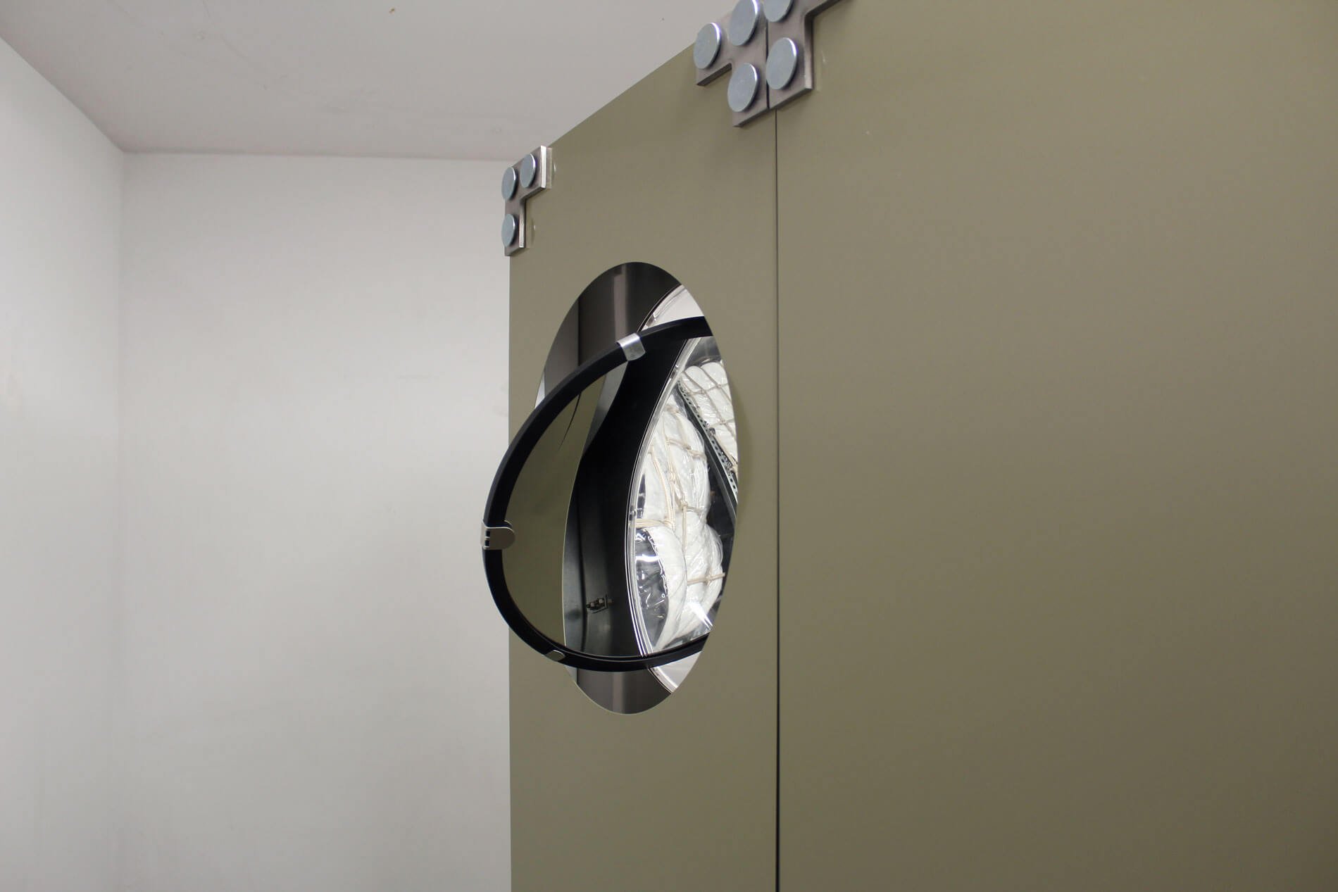 From outside, the installation appears propped on wheels. An air conditioning unit and sand-blast glove pop out of the volume.