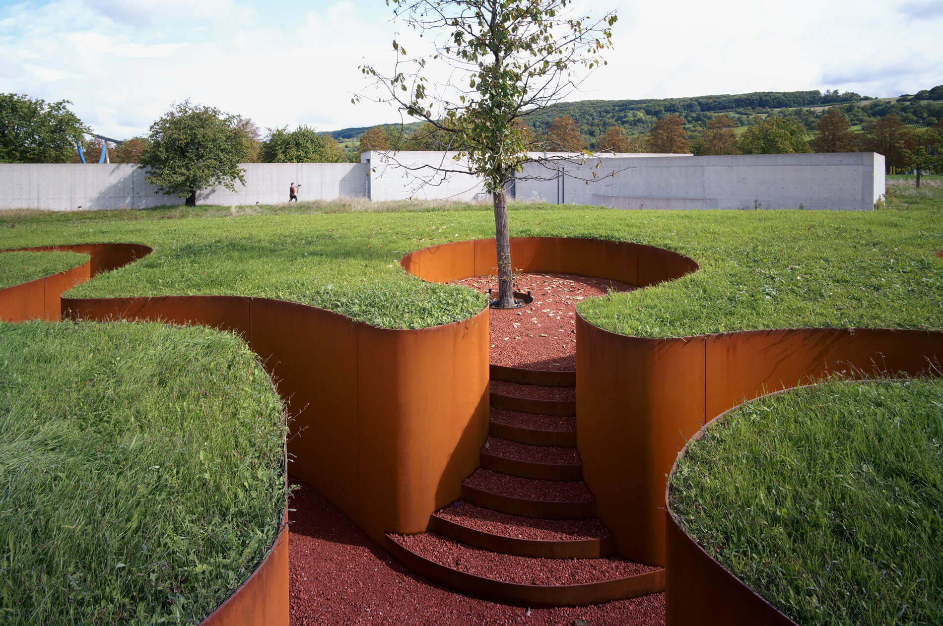 The sculptural new addition to Vitra’s campus is made of low carbon-emission metal, a composite material made of scrap steel produced entirely with renewable energy. Its patina will darken over time thanks to controlled corrosion.