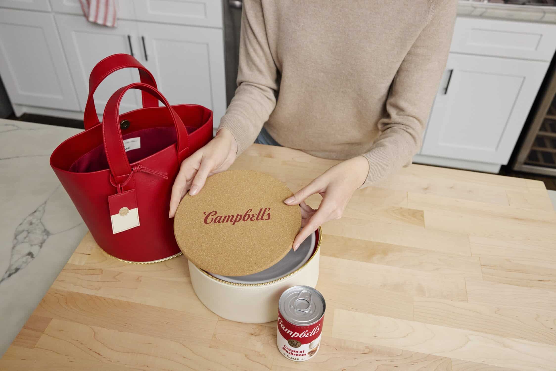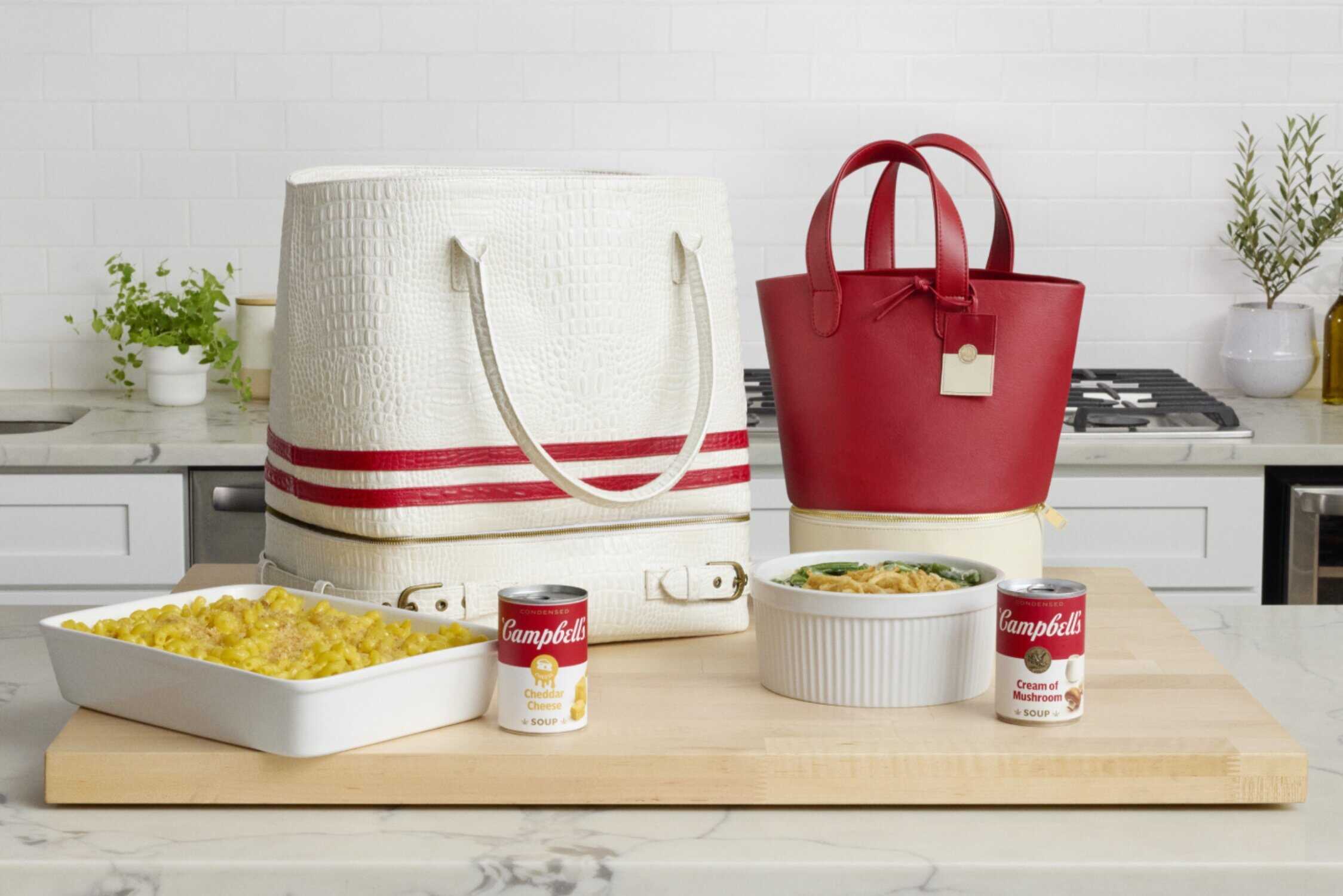 Kit: We can riff forever. When we started with this opportunity, we had a million ideas. That’s where the Campbell’s team was so helpful, being like, “This is something that could work really well for our audience.” We worked together to pick every aspect of both of the bags. That process was really fun, because you start with all of these crazy, out-of-this-world ideas, and then it’s about bringing that product to life. Especially with these bags, you really have to meld fashion and function. We did a lot of testing to make sure that the bags were actually functional, able to carry ice, drinks, casserole dishes, all of that. They look great, and you want to walk down the street wearing them, but you also have to think about, “How is this going to function in someone’s life? How are they going to be able to bring their favorite sides and their favorite drinks to a party?”