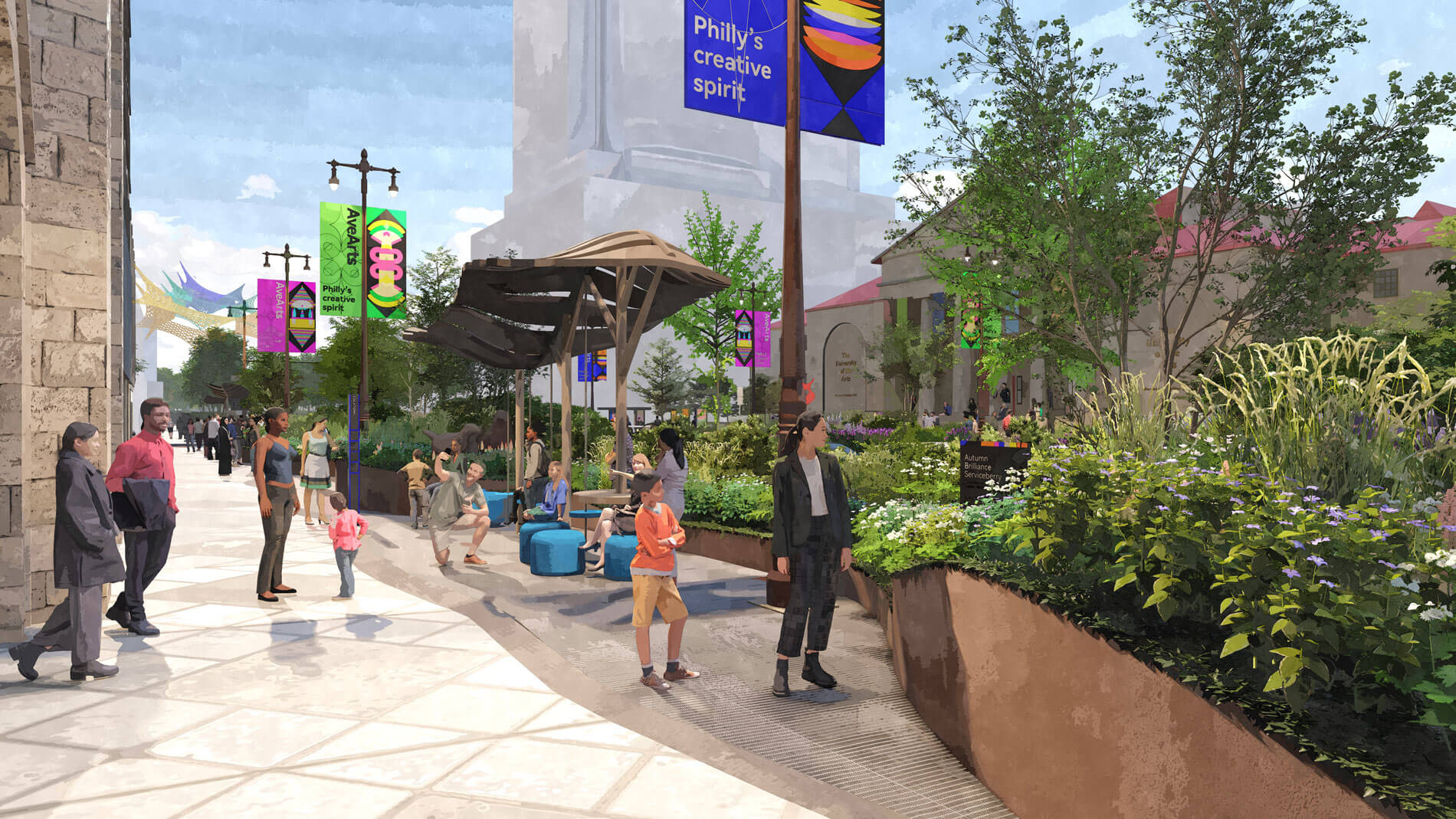 Ten blocks between Philadelphia City Hall and Washington Avenue will have new landscaped medians, enhanced lighting, outdoor performance spaces, rotating public art and sculptural elements, plantings, trees, street furniture, artist-designed banners, better wayfinding, and more as part of the program.