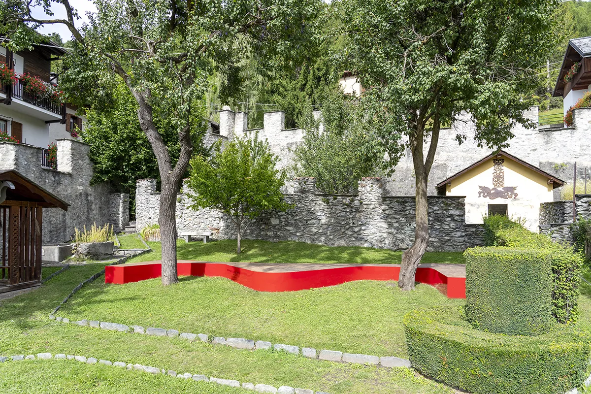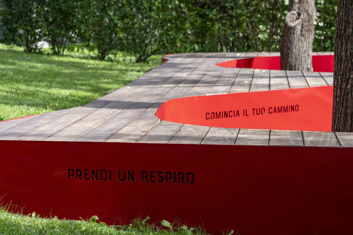 The choice of materials also reflects this intention through the use of wood, gravel and red-painted metal to highlight the new interventions in relation to the existing features. The colour red, the leitmotif of the project, serves as a visual cue to guide visitors into the space through an experiential journey in several stages, designed to foster a connection with the surrounding nature and the place’s history.