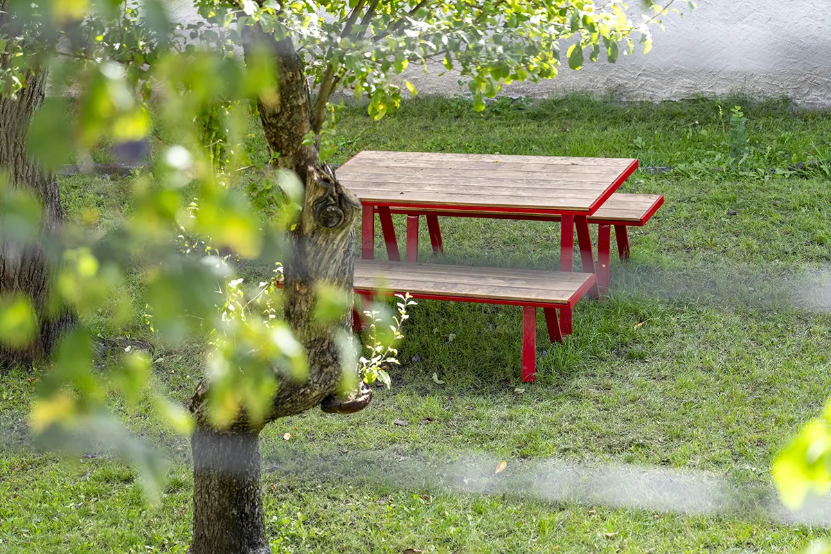 Next to the garden, there will be a relaxation area with wooden and metal tables, coordinated with the other planned furnishings, allowing visitors to enjoy the shade of the trees and the surrounding buildings during the warmer months.