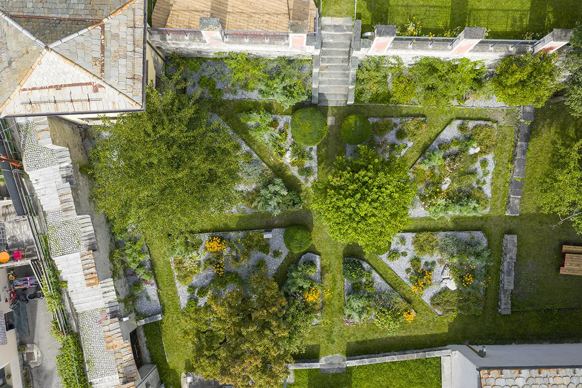 From the very first site visit, the space’s intrinsic beauty was clear. Like a secret garden, hidden from view from the outside, it is nestled between the gray walls of local stone and the historic building used as the Civic Museum, allowing the gaze to sight out over the mountain panorama.