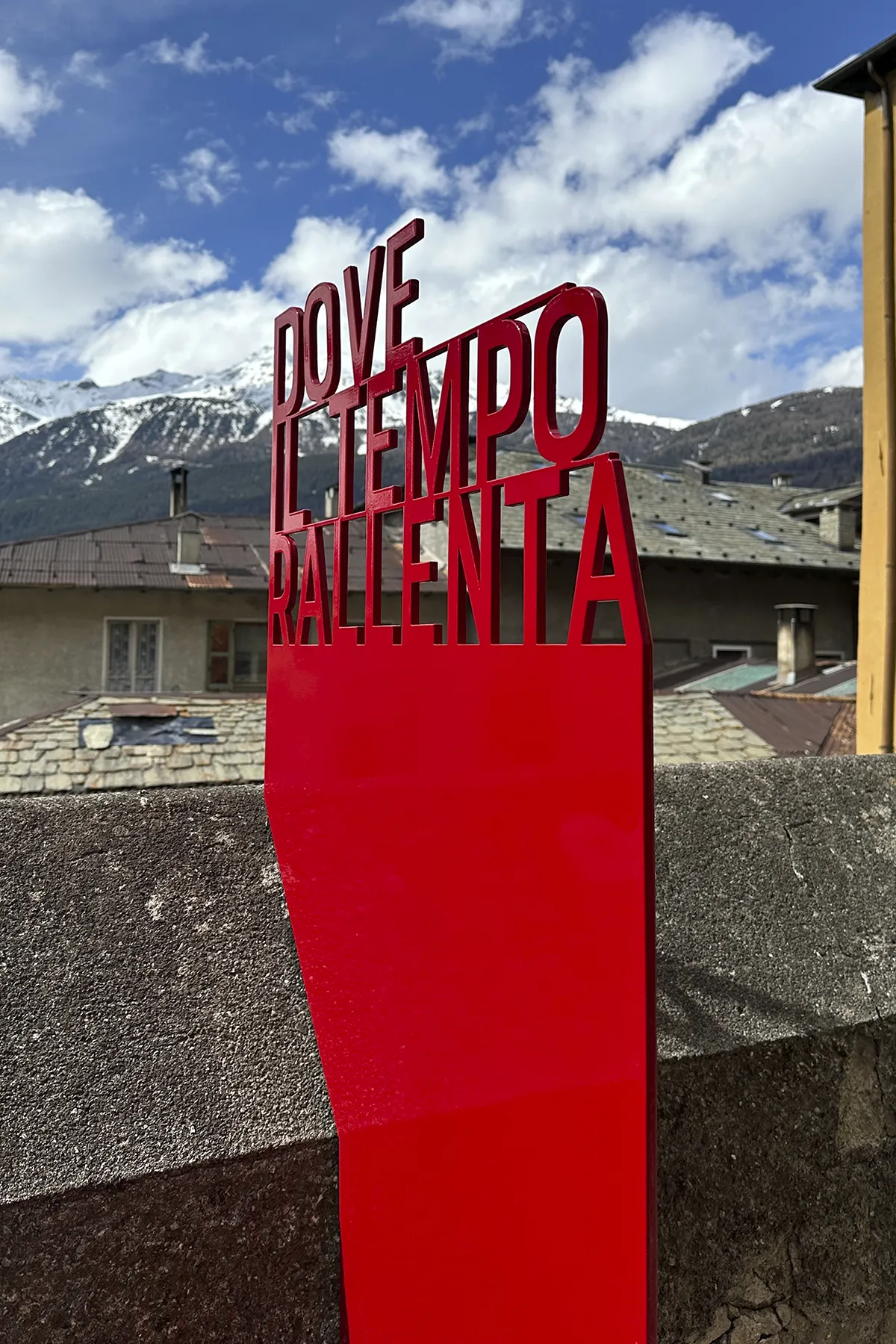 To the left of the Civic Museum’s entrance, on Via Buon Consiglio, a passageway leads to a portico that provides access to the building’s courtyard and garden. Here, an initial installation interacts with the existing parapet and captures the visitor’s attention, anticipating the garden’s central theme, with the caption “Dove il TEMPO rallenta” (“Where TIME slows down”).