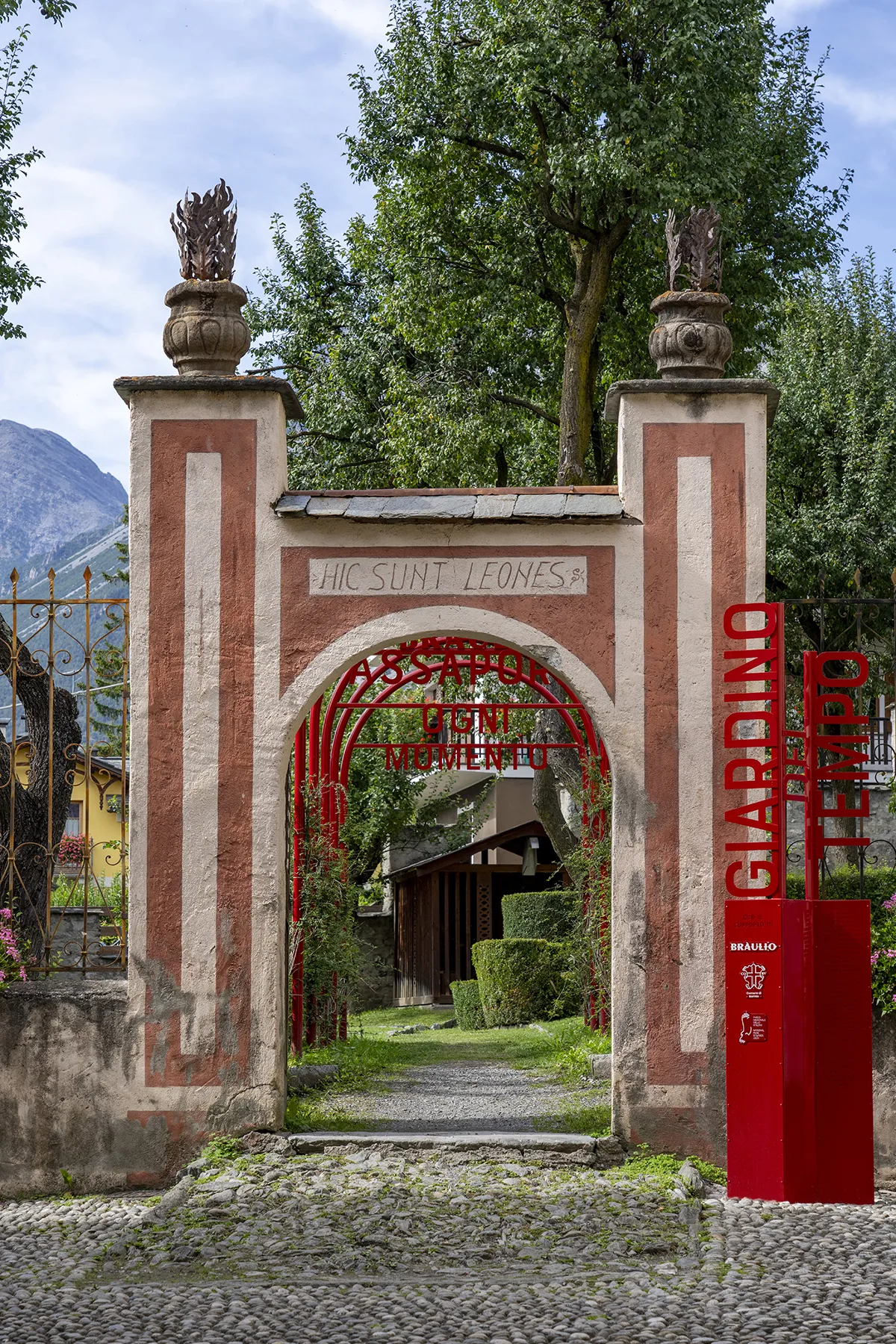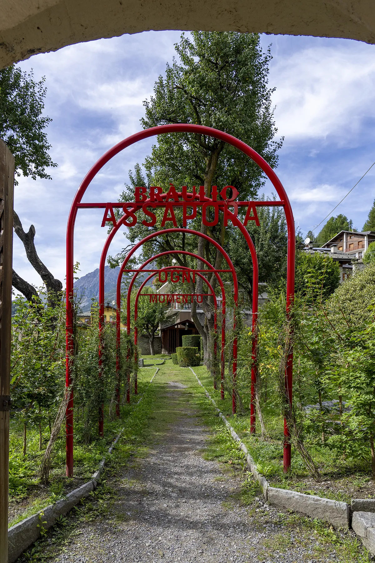 To identify the building’s courtyard entrances and the staircase on Via Monte Braulio, the project involves installing two red-painted steel totems that visually draw visitors towards the garden. Once through the main entrance, a portal consisting of five red arches, covered with climbing plants reminiscent of an Italian garden, bears the inscription “Assapora ogni momento” (“Savour every moment”).