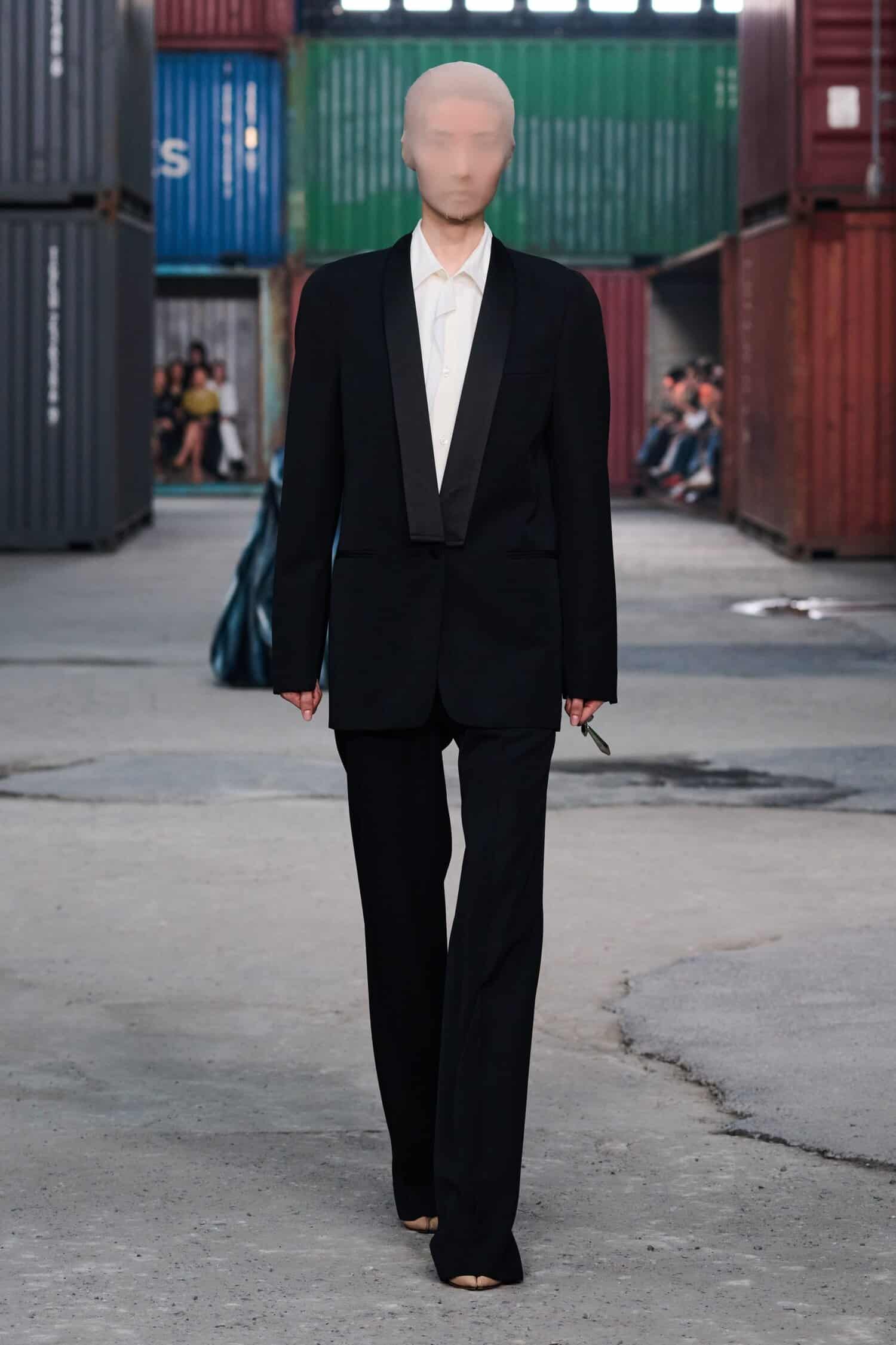 Variations on the classic tuxedo — arguably the biggest trend of the season — made multiple appearances throughout the collection: from a jacket with an upside down shawl collar, its edges left raw like a scarf, to black and white version fused to a layer of second skin jersey, to  an Edwarian tailcoat painted bianchetto, baked and the cracked open and paired with matching evening pants and boots.