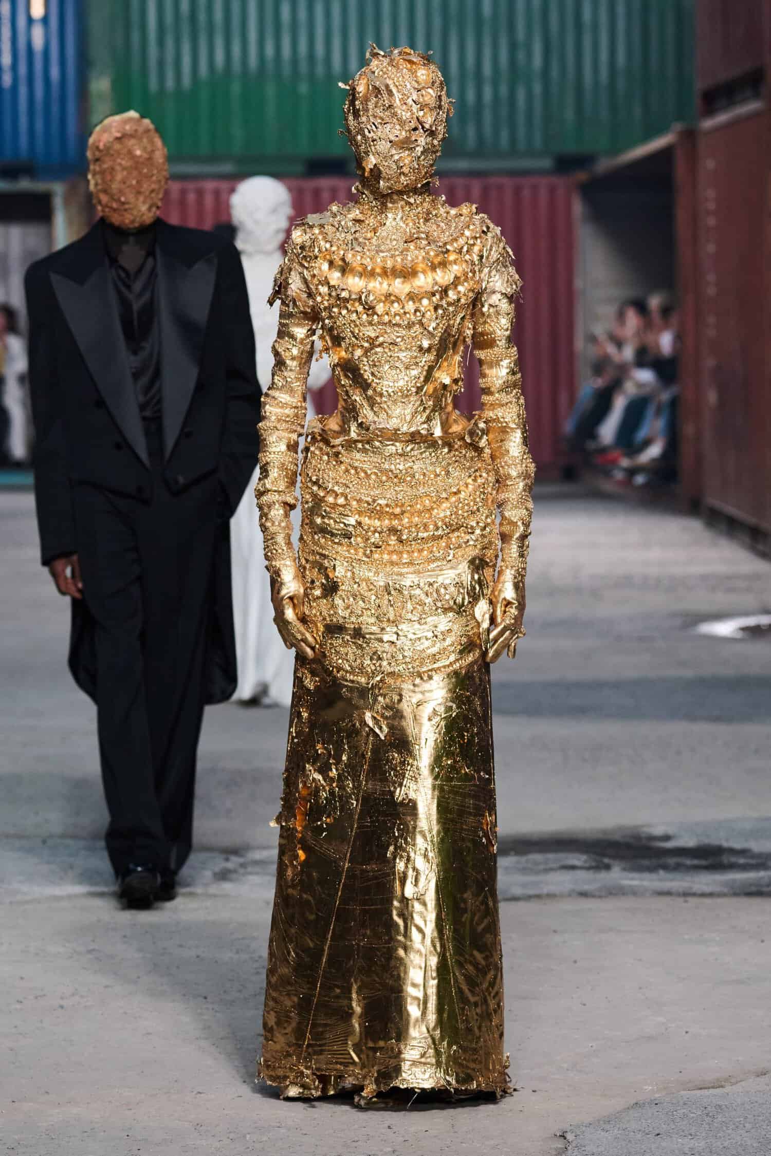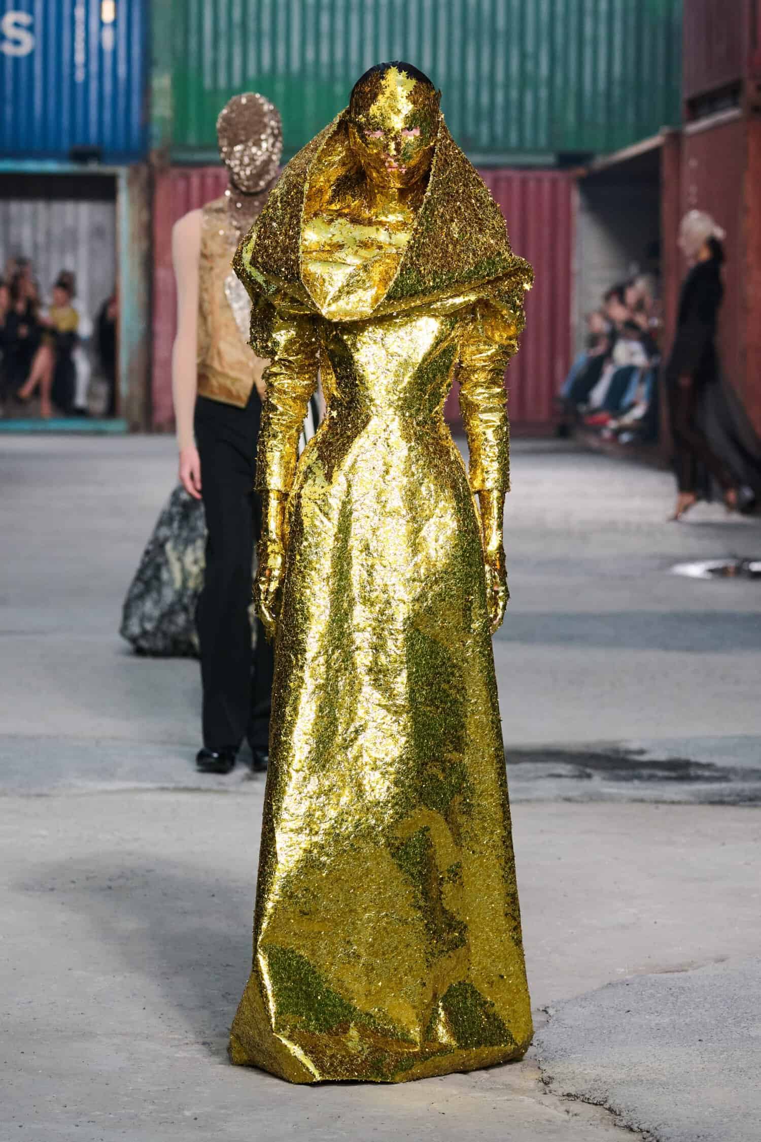 Two gold gowns offered a playful contrast in materials and with the first made from five pieces, all gilded in gold leaf and taking 200 hours to complete, and the other covered in over 150,000 hand-applied gold stars, requiring the work of 34 artisans over 2975 hours.