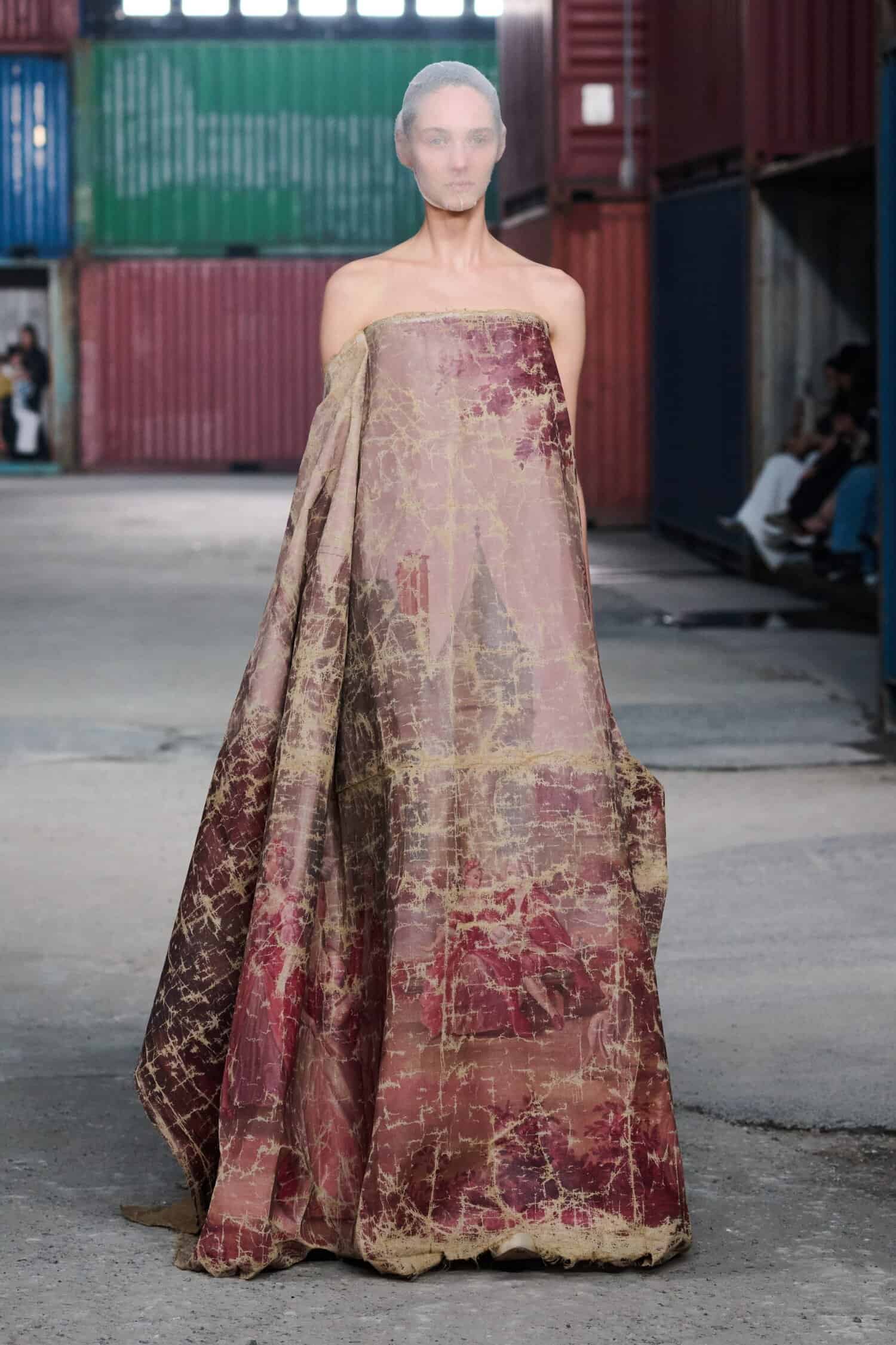 The show concluded with a dress made from a 19th century painting that was found on the floor of a flea market. The painting was beyond any sort of meaningful restoration, so Martens and his team set about giving it new a life. First, restorers spent a week fixing its state of disrepair, to ensure no more paint would fall from it. Then, a gown was constructed without once cutting into its 5 metre-long canvas. The painting was draped over a double corset, one fitted to the body, then another standing away, over which the painting could take its shape. The painting thus remained entirely intact so that, should one wish, they can remove it from the underlying corsety and hung it on