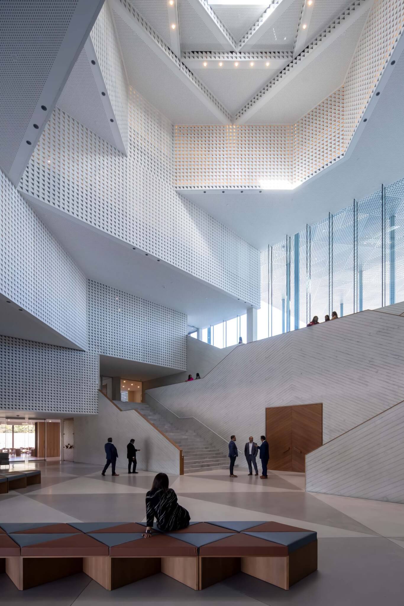 Across its elevations, the stone varies between circular or triangular corner perforations, parallelograms, and toothed triangles. Light filters through the glass cutouts within the stone, acting as a mashrabiya, or a screen that is common in Islamic architecture. As one walks around the building, the changing geometries provide different levels of privacy and openness beyond the screen. As the sun sets, the illumination reverses directions: The light spills through the stone screens, and at night the building becomes a beacon of light.