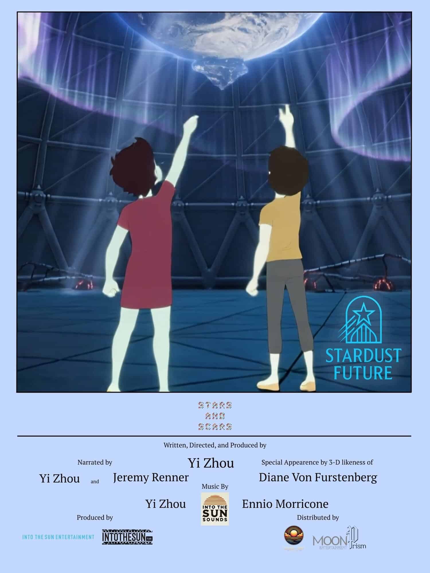 From visionary filmmaker and multimedia artist Yi Zhou comes Stardust Future: Stars and Scars, the first ever full 82 minute animated feature created entirely with artificial intelligence. It’s a sweeping odyssey that merges art, sound, and consciousness into one continuous experience. Following the documentary Chronicles of Disney and the original song Rising Sun at the Edge of the Ocean, Zhou reunites with Jeremy Renner, who after surviving his near death experience returns as an Oracle of Time, a voice from beyond guiding viewers through the birth of the cosmos, the evolution of human awareness, and the future of humankind. (Renner and Zhou are allegedly seeing each other romantically these days)