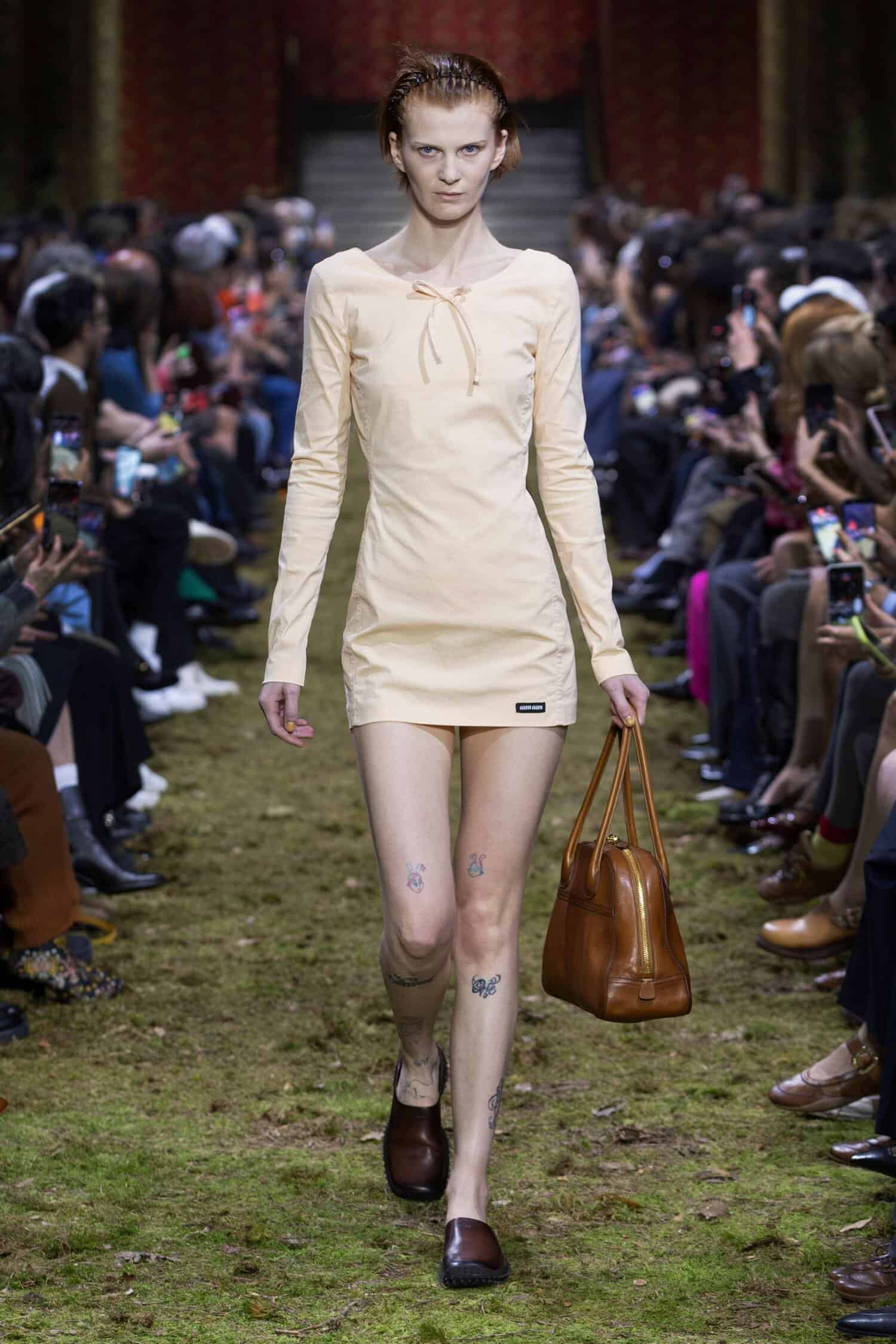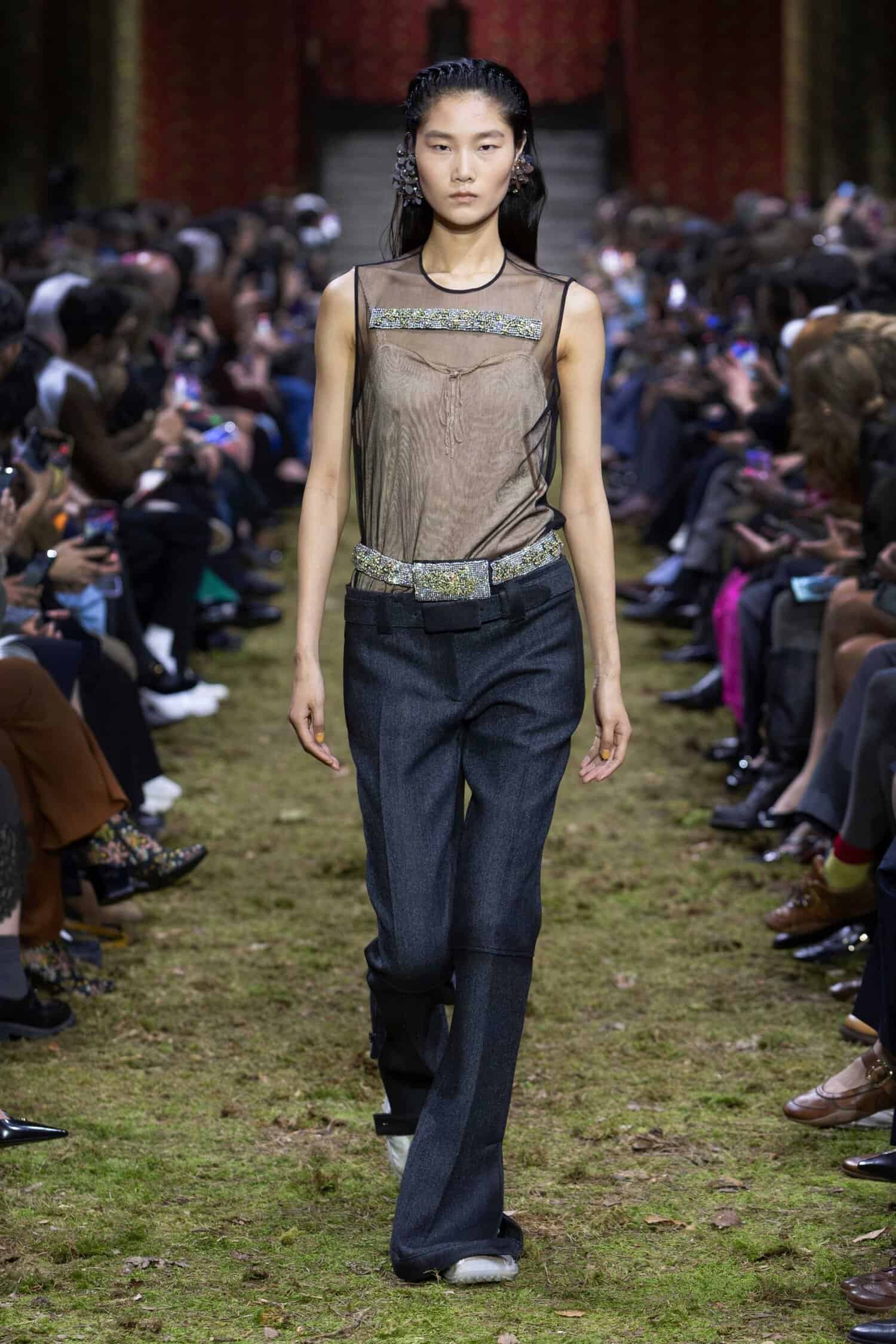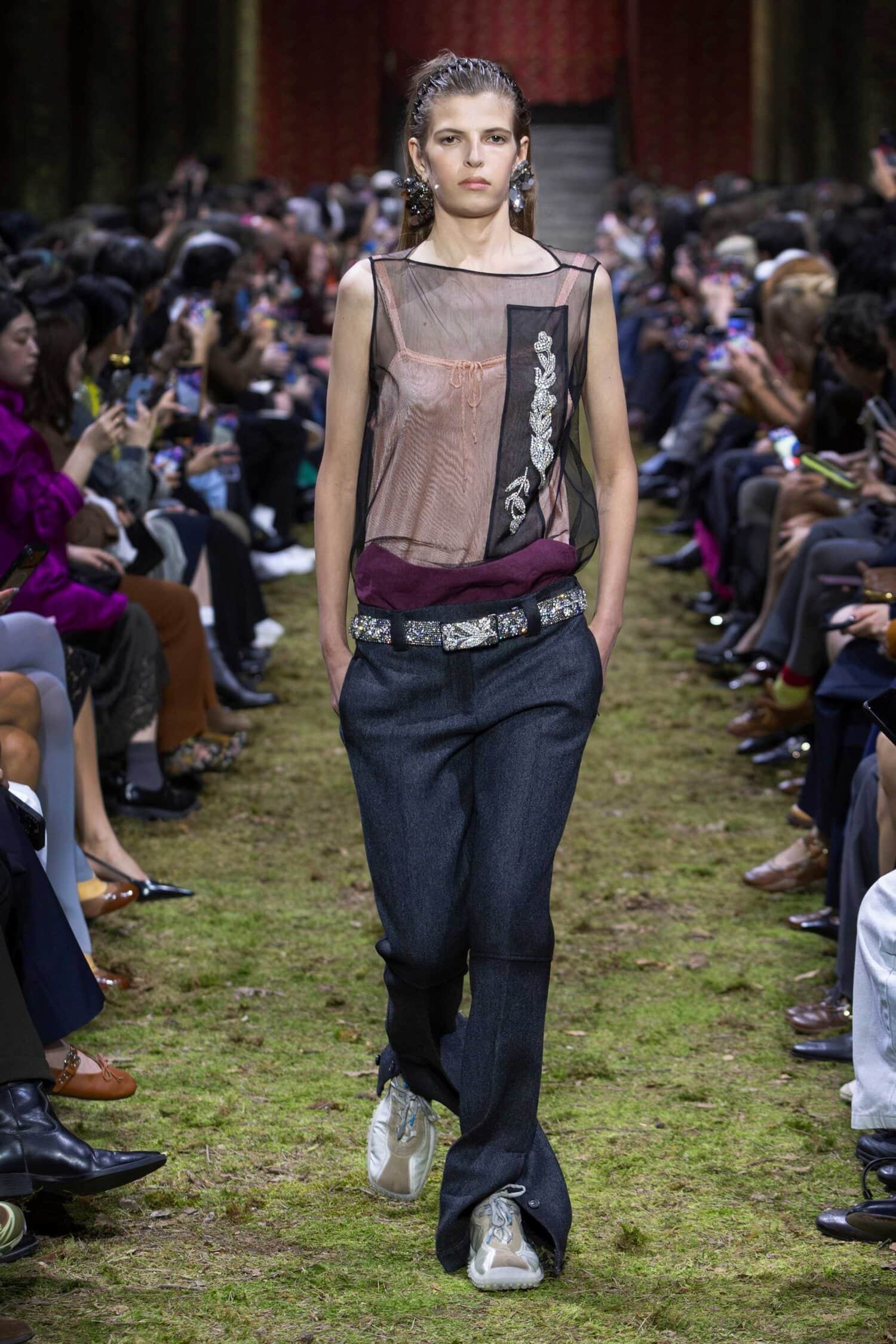 But it’s the three peachy dresses on Gemma Ward, Kristen McMenamy, and Gillian Anderson that are the most blinged out and, thus, feel the most Miu Miu of all. Worn with confidence and grace by the show’s oldest models, they demonstrate that the Miu Miu girl is not a girl at all. Not necessarily. She’s a woman. Or a man (there were menswear looks too). Miu Miu is not designed for some abstract and dated idea of youth. It’s beautiful clothes for anyone who wants to wear them.