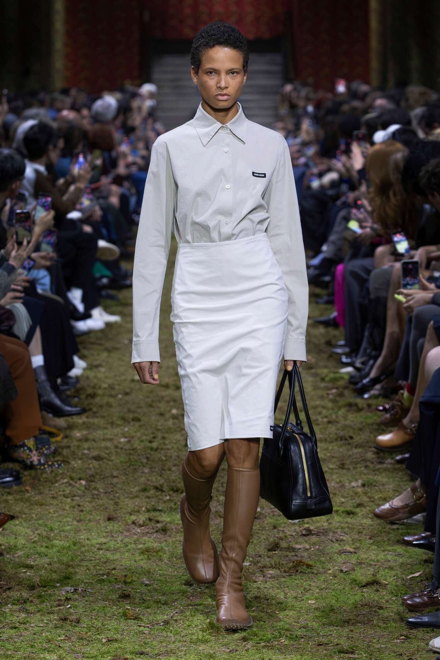 Then there are those little Working Girl pencil skirt looks, which feel very much like what the Miu Miu girl might wear to her internship at a bank. They’re not quite right for said scenario, but they’re simple and clinical without a single jewel or bow in sight, so, you know, she is trying!