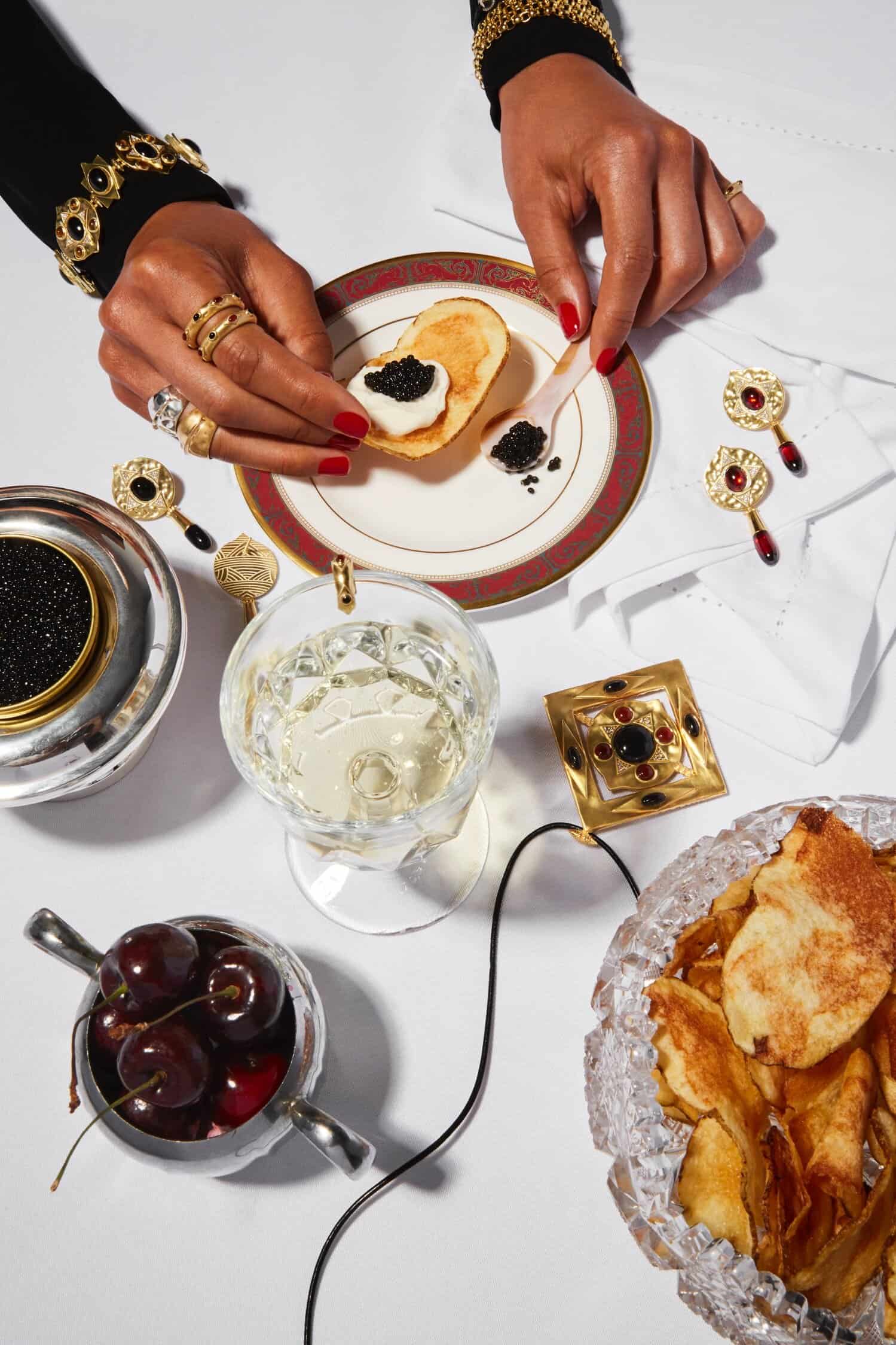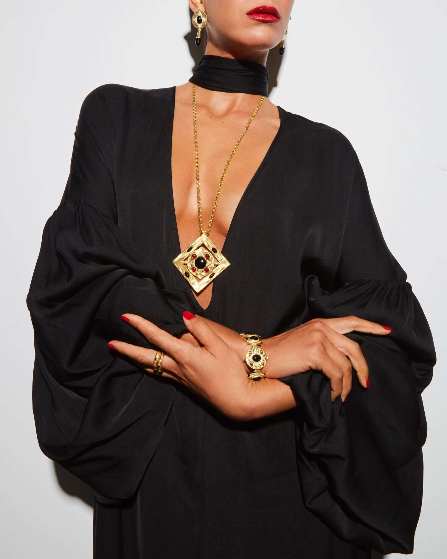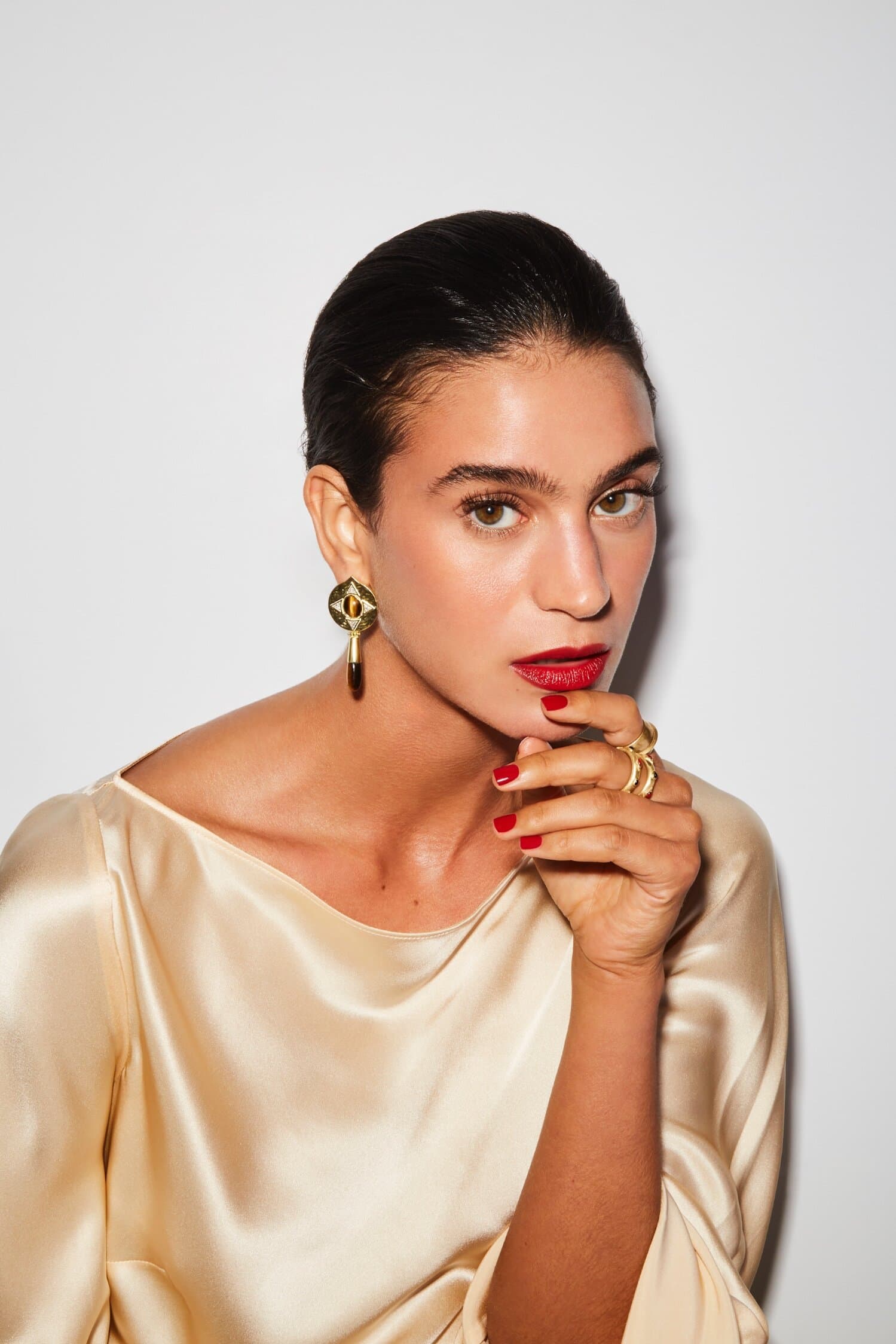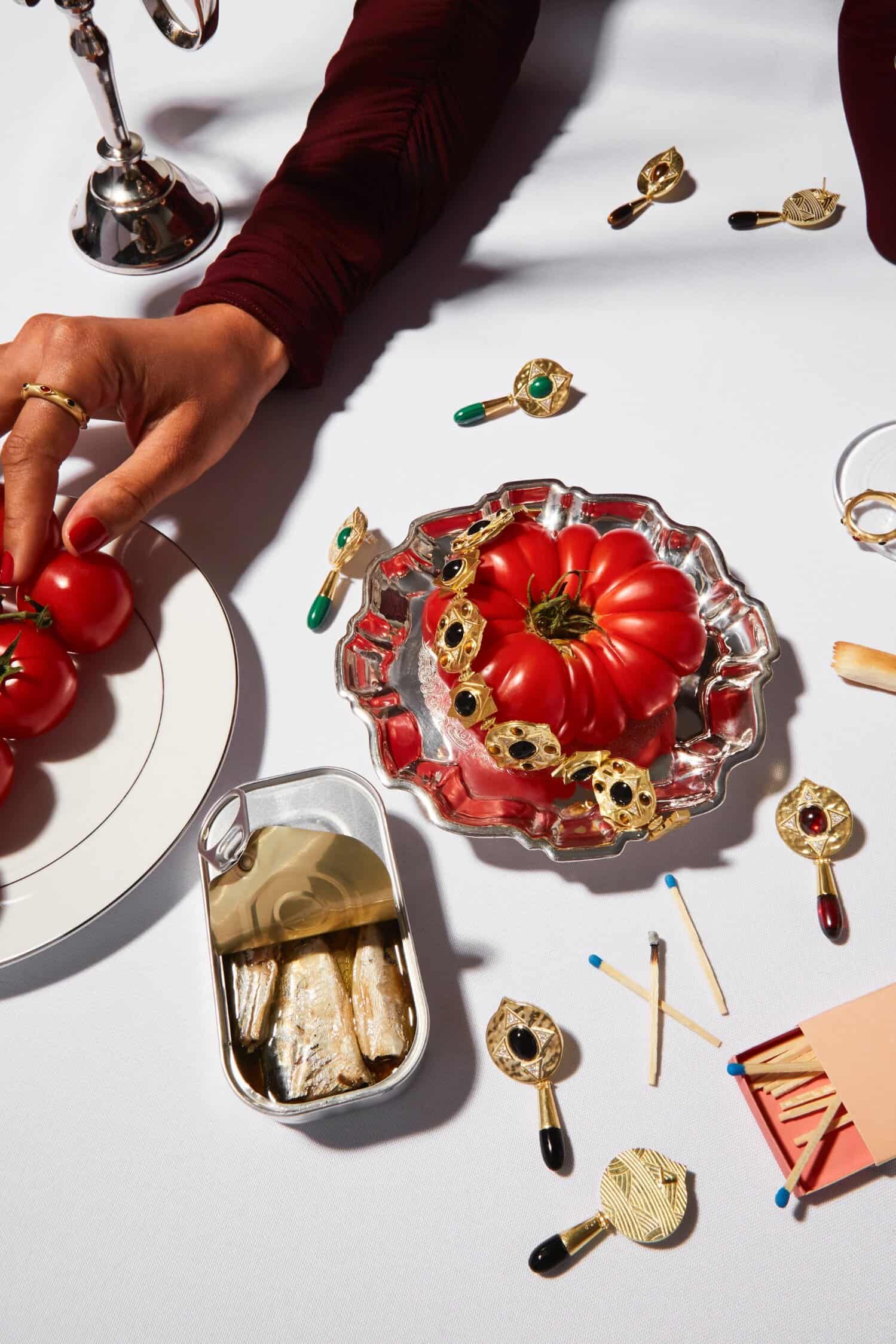 Having just launched, Richie’s new collection has leaned into this ethos with a focus on ornamentation inspired by Hathor, the Egyptian goddess of beauty. Standout styles included teardrop earrings, pendant necklaces, and hinged bracelets studded with luxe stones from tiger’s eye to malachite and onyx—in addition to sparkling pavé diamonds for a pop of glamour. However, clients at MARKET also discovered new made-to-order designs from Richie’s demi-fine jewelry collection Bespoke, bringing her free-spirited ethos an even more personalized touch.