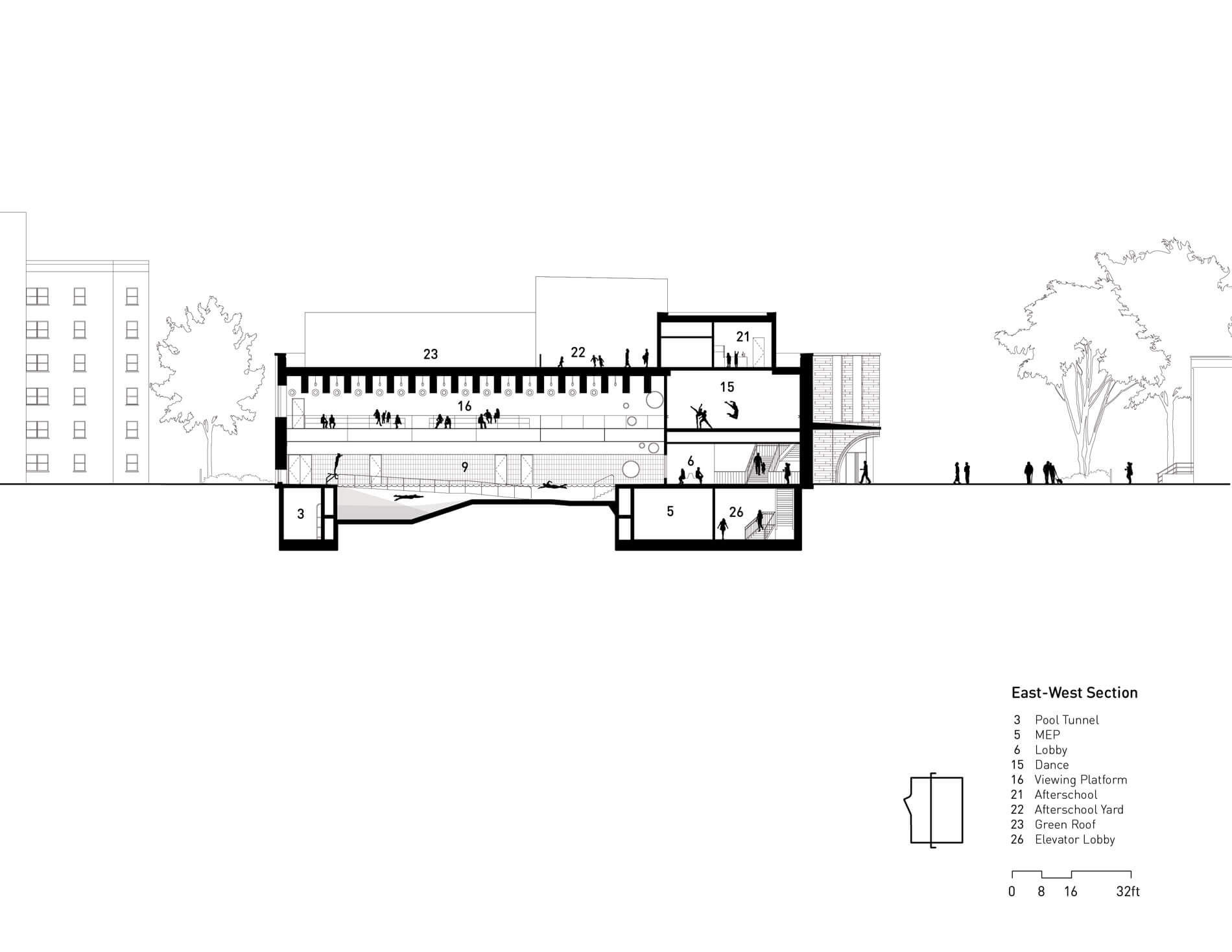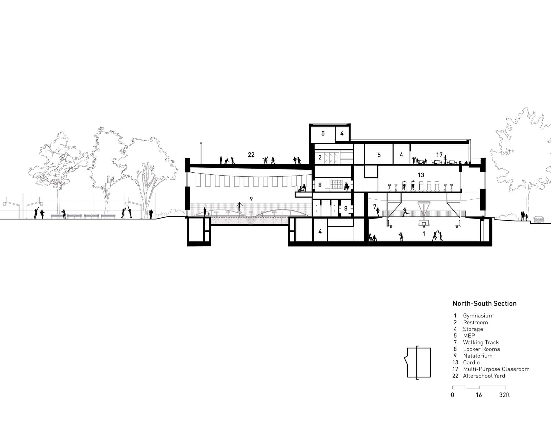 In section, the basketball court is located below grade, and the swimming pool at grade. Strength, lifting, and cardio rooms; and a dance studio are on the second floor while more passive uses (an after-school and teen area, teaching kitchen, and media lab) are folded into the third floor, coupled with an exterior terrace.