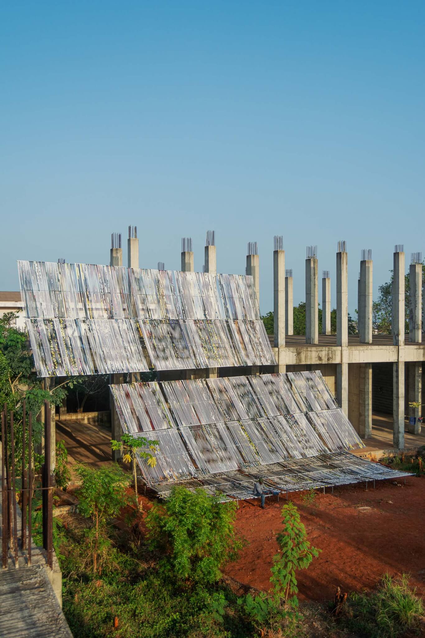 “The frames are modular and light enough to be carried by one person,” Benson-Strohmayer said. Repurposed materials composed of chartreuse, magenta, and blue hues weave between the frame’s rails. The resulting facade is a sheer skeleton whose gaps create an illusory effect when situated among the verdant foliage of Ghana’s surroundings, the pale sky it intersects, and the concrete structure. Joseph Awumee oversaw the metalworks installation and Briena Montana served as the weaving lead.