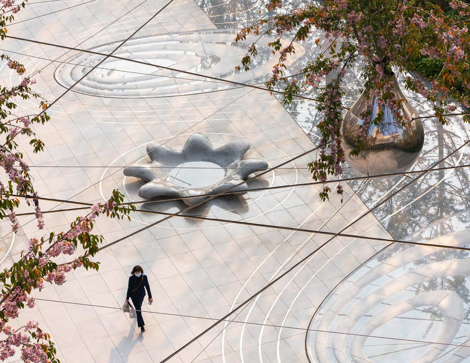 “Rain Drops” are expressed by twelve polished stainless-steel elements suspended above the plaza. They reflect the surroundings, the plaza, people, sky and act as