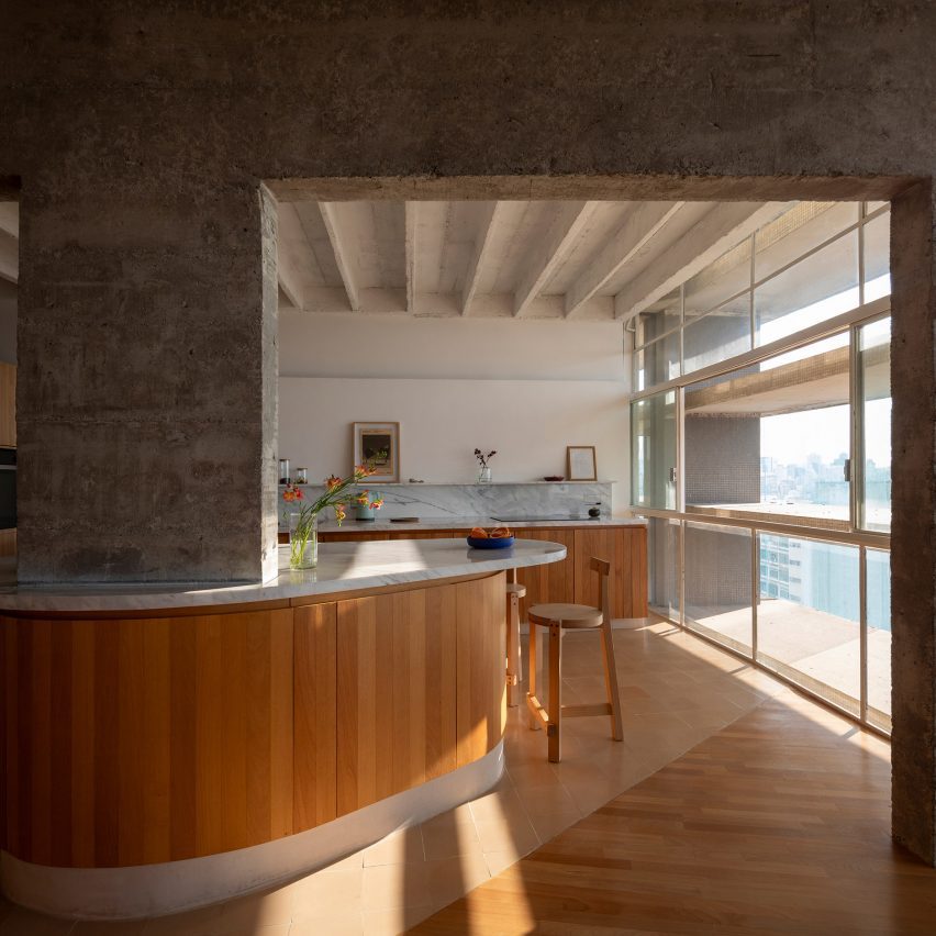 Located inside the Oscar Niemeyer-designed Copan building in São Paulo, this apartment was redesigned by Estúdio BRA to highlight its architectural features.