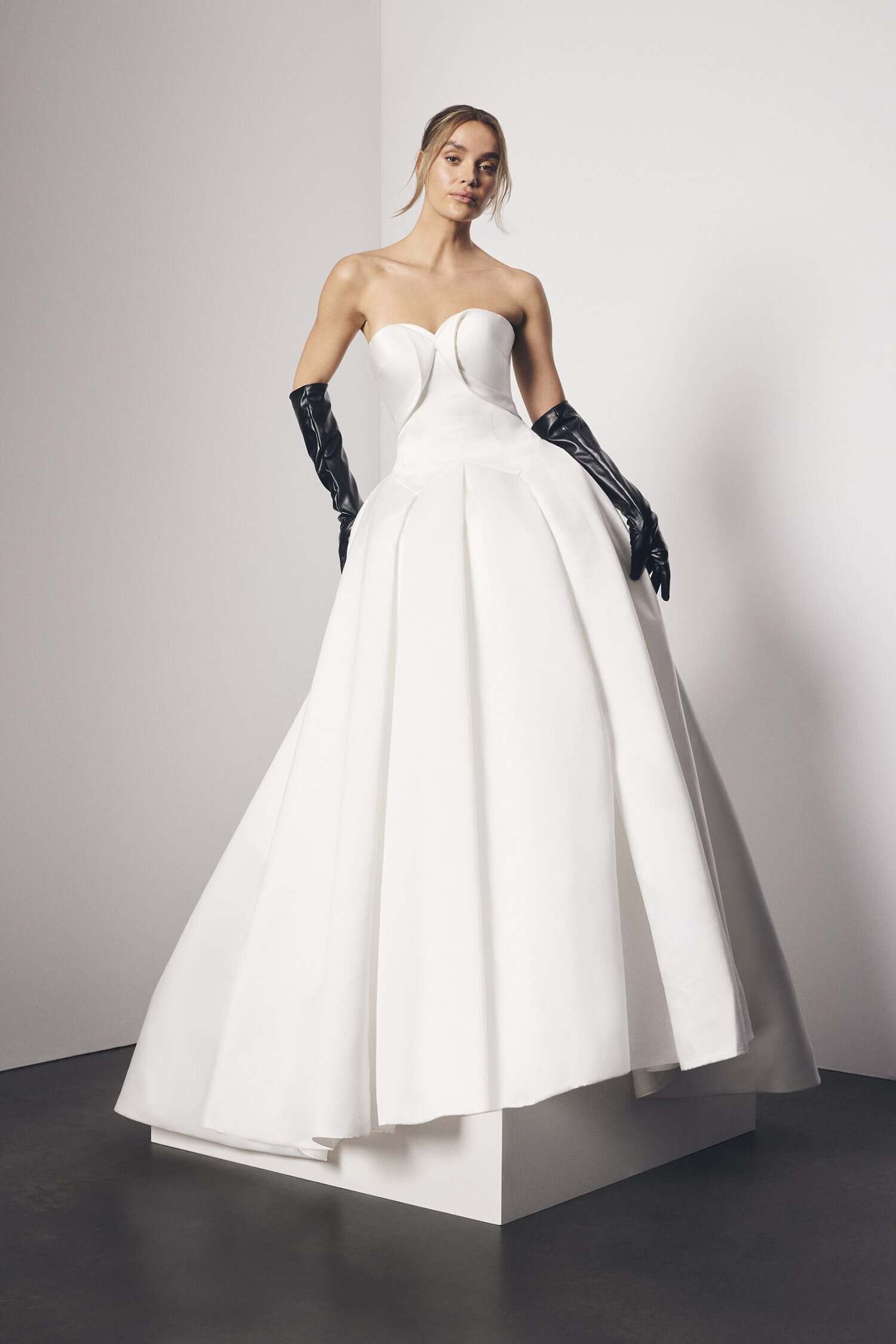 The new collection premiered on the David’s Bridal website April 7, with prices ranging from $2,299 to $4,999 (similar to when the brand was at Pronovias).