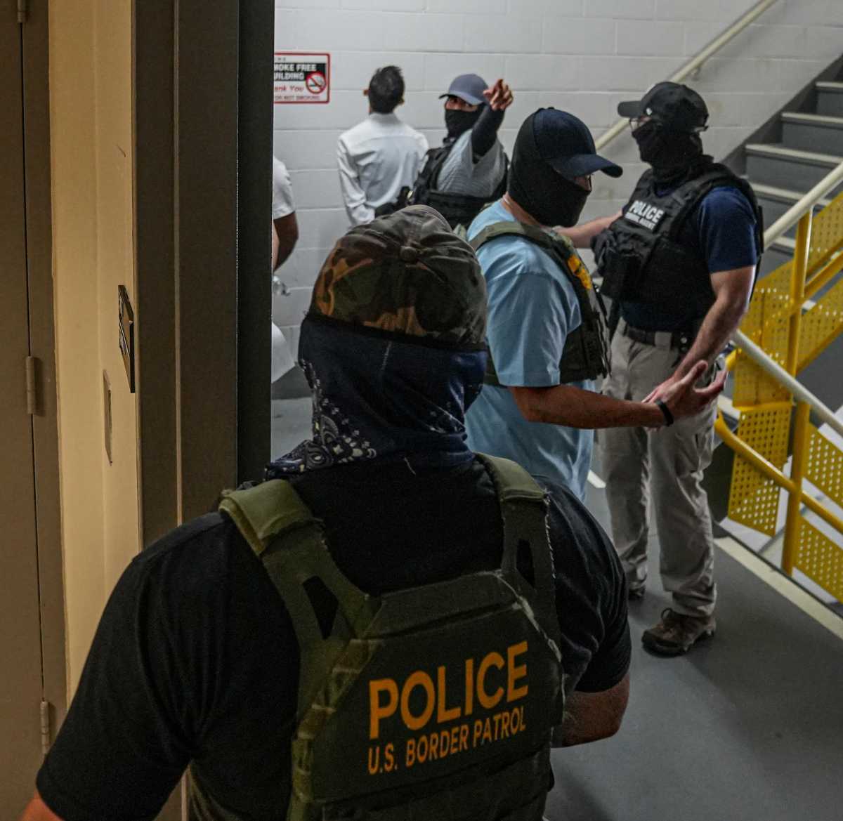 In July, immigration enforcement inside 26 Federal Plaza ramped up, with detainments becoming more heavy-handed. The agents changed tactics in July by rushing people into stairwells instead of loading them into elevators. This month also saw an apparent health-related emergency of a man who collapsed after being whisked into a stairwell. As the door swung open, he could be seen lying on the ground with his hands handcuffed as a masked agent looked over him.
