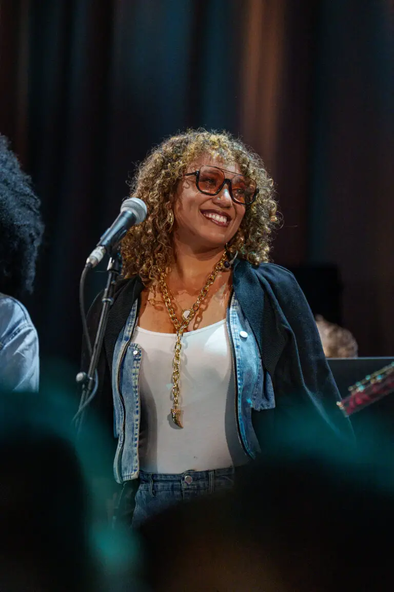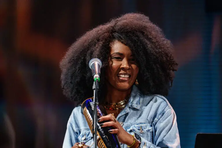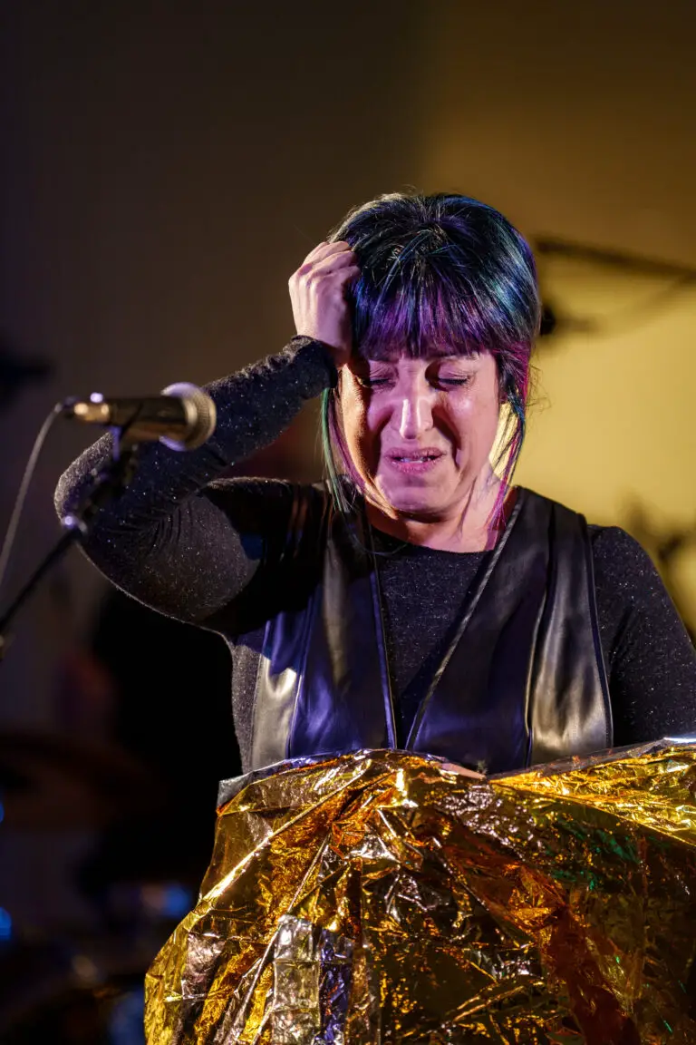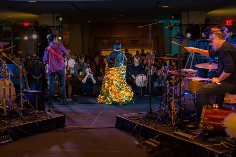 Following the Saami Brothers was Maria Mazzotta, an Italian operatic singer. Performing in the lobby of David Geffen Hall, she combined traditional soprano virtuosity with rock and folkloric traditions to create a powerful visual and harmonic experience. Calling where she comes from, “a little strip of land in the Mediterranean sea,” she dedicated her set to “all those who perished in the sea.” It was impossible not to associate those statements with migrants fleeing persecution and war – especially as she started the set wearing a gold emergency blanket like what would be given to someone after a rescue. Her haunting vocals rang out over a wailing guitar and steady bass for most of the set, making it feel like her message was more quintessential than creating a joyous sonic experience.