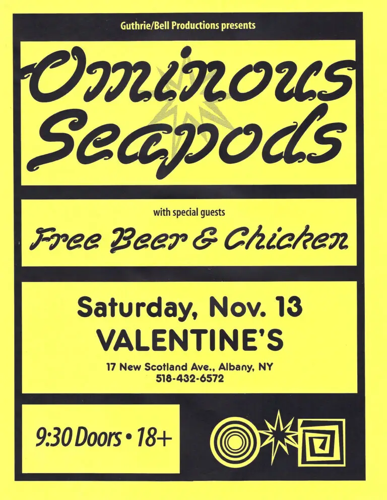 The late 1980s into the early 1990s was the launching point for these five artists, with Dr. Jah and the Love Prophets starting earliest in 1987, linking up with Bell early on. Ominous Seapods got started in 1988, playing shows at Bogie’s with Howard Glassman (later the owner of Valentines) and connected with Greg by 1994. Conehead Buddha, Peter Prince and freebeerandchicken all got going in 1993 (with Eastern Highs starting in 2015), and all bands tracing the roots of their Capital Region success to Greg.