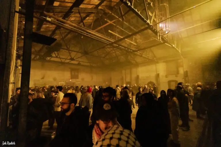 But before there were Explosions, there was Kingston’s Open Head. Comprised of Brandon Minervini, Jon McCarthy, Jared Ashdown, and Dan Schwartz, the experimental four-piece have become a staple of the Hudson Valley music scene in recent years. Taking the dimly lit stage to little fanfare, the band launched into a sprawling sonic assault that immediately caught much of the audience off guard. Drawing from no-wave, avant-garde punk, noise, and electronic music, Open Head’s sound stood in sharp contrast to the headliner’s meticulous, slow-burn compositions. Their set was disjointed, intense, and unapologetic, oscillating between distorted spoken-word passages and bursts of pure punk fury. Featuring mostly material from their 2025 album What Is Success, the band steadily won over a substantial portion of the crowd by the end of their set, an impressive feat and a hot start to an incredibly cold night. After a brief intermission, anticipation in the room was palpable as a dense fog consumed the old factory warehouse.