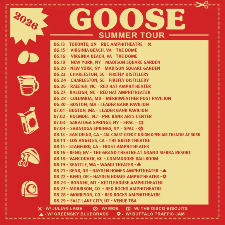 Goose will kick off its 2026 live schedule with a top-billed performance at Athens, GA’s annual Jam in the Streets street music festival on March 28, followed by headline dates beginning April 10 at Asheville, NC’s ExploreAsheville.com Arena and continuing through the month.