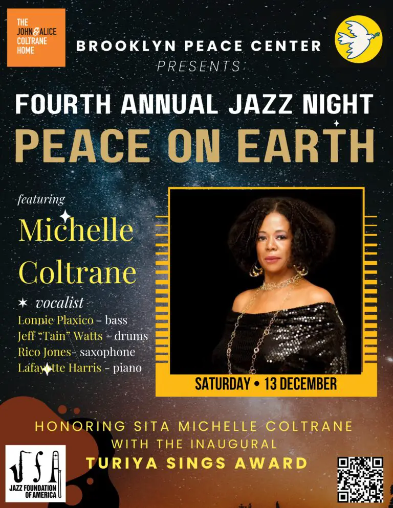 The Brooklyn Peace Center has announced the Fourth Annual Jazz Night: Peace on Earth, featuring Michelle Coltrane & Friends, on Saturday, December 13. A beloved Brooklyn tradition, Jazz Night brings together artistry, spirituality, and community in a celebration of peacebuilding through arts & culture.