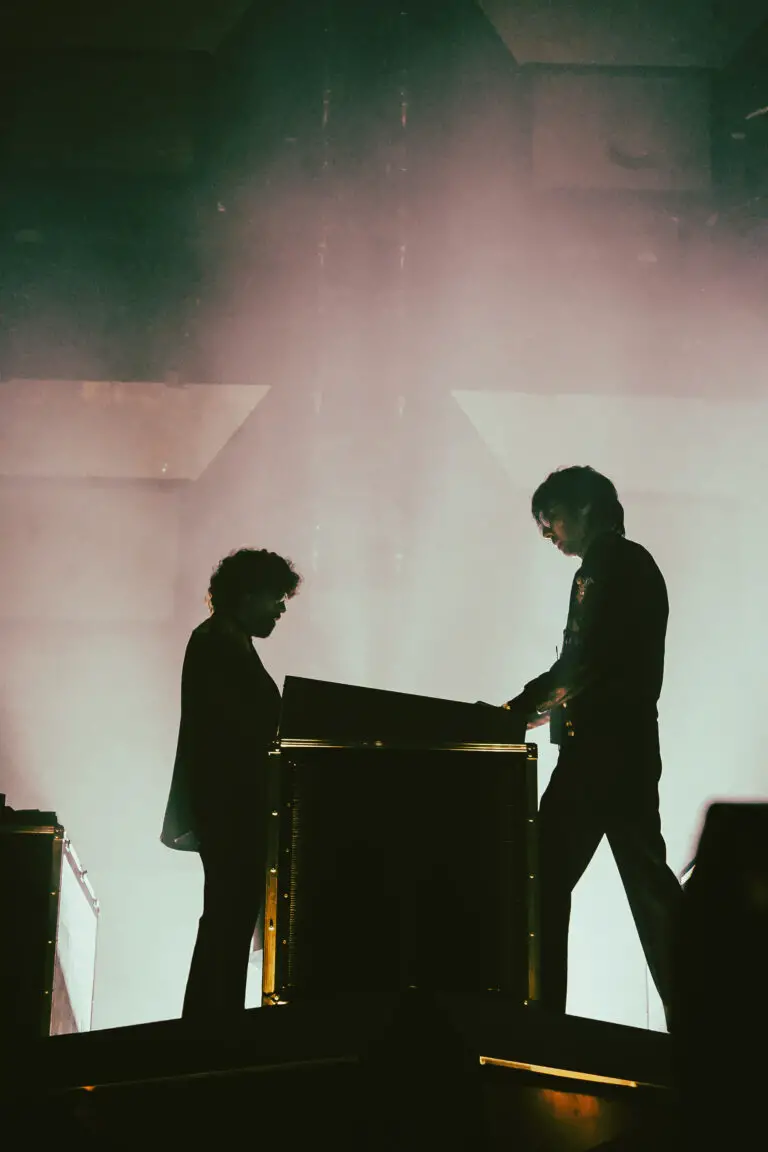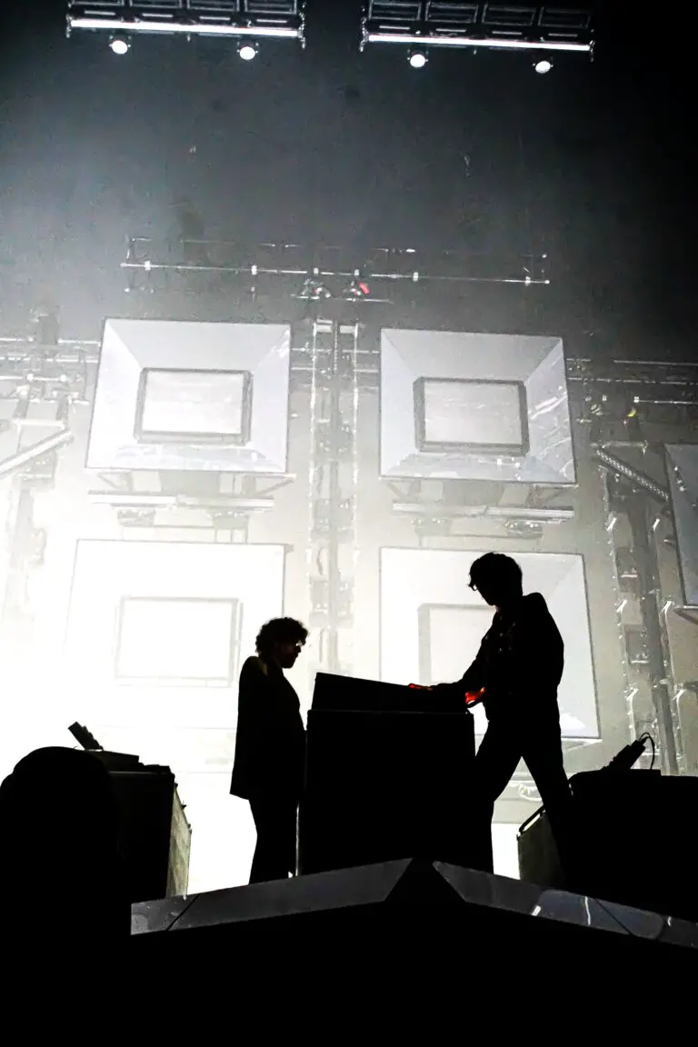 Following a quick stage reset, Justice emerged: Gaspard Augé and Xavier de Rosnay framed by their towering “×” logo and an arsenal of lights and lasers. From the very first beat, the vibe shifted: the arena felt smaller, tighter, more intense. The duo moved through a frantic, high-paced sequence of their biggest hits and newer material, lacing distorted synth lines with pounding four-on-the-floor drums and unmistakeable rock-in-the-club energy.