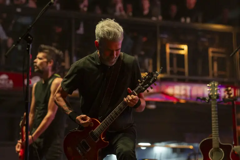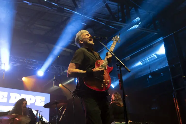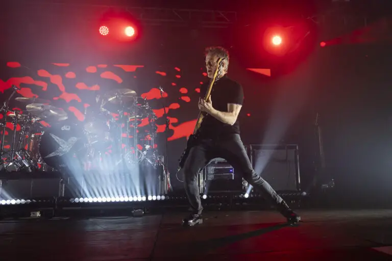 After a brief changeover, the stage was set, literally, for Our Lady Peace. As the house lights dimmed, fans were treated to a video montage of highlights of their over 30 year career. The clips included interviews, music videos, and live shots from their 1999 set at Woodstock 99, in Rome, New York. At last the band took to the stage with a thunderous ovation and quickly, the venue was filled with the rhythmic and hypnotic bass line of “Automatic Flowers”. The slow building track off of Clumsy led nicely into the second track, the anthemic sing-along “Innocent”.