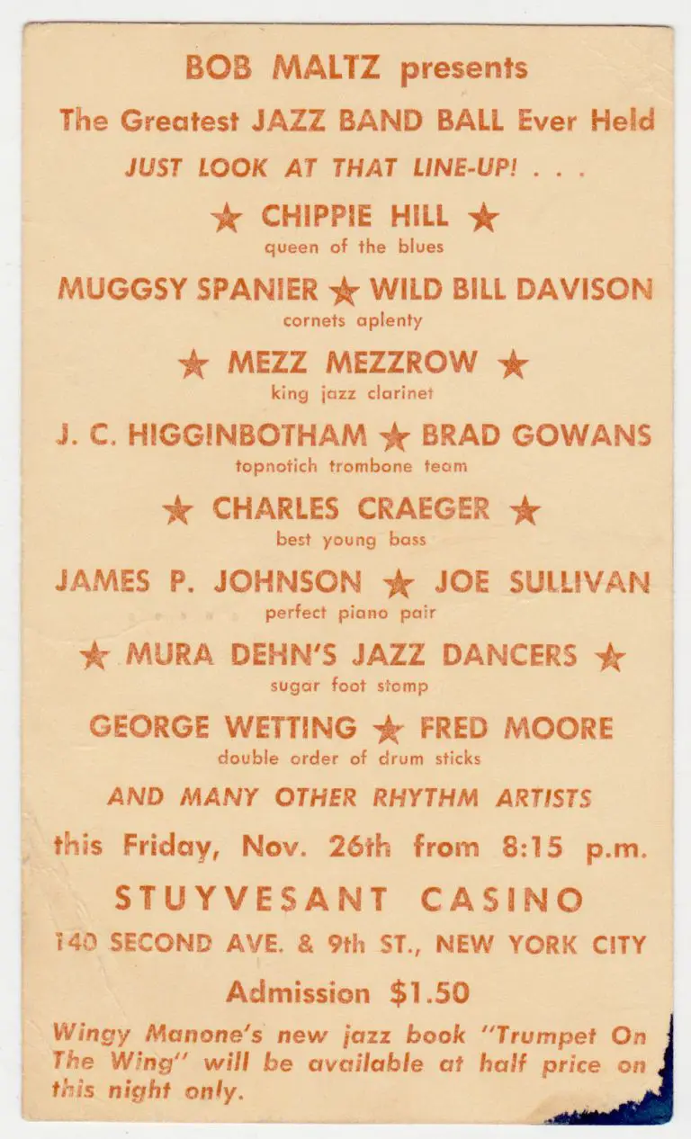Robert Thompson, a Dixieland drummer known for his group The Red Onion Jazz Band, recalled Bob Maltz as an organizer of jam sessions at Stuyvesant Casino that attracted well paid world class musicians. The Red Onion Jazz Band served as legendary Dixieland revivalists, borrowing the name from Clarence Williams’ traditional New Orleans supergroup Red Onion Jazz Babies, which included Sidney Bechet and Louis Armstrong playing together for the first time in studio.