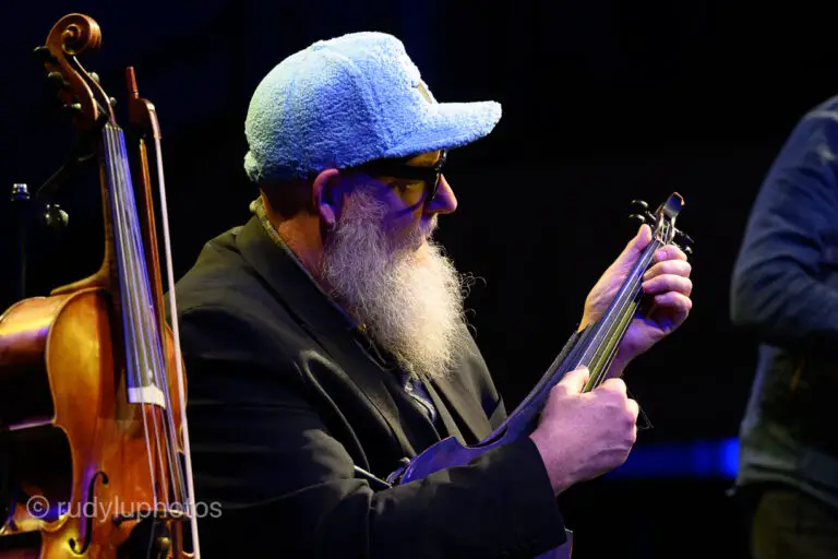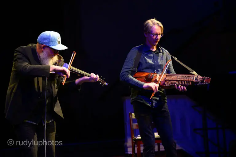 His colleague Olav Johansson plays a Nyckelharpa, a hurdy gurdy-like keyed fiddle with three melody strings played like a pedal steel guitar. There is a bass string and a dozen others that are allowed to vibrate freely to add to the polyphony and complexity to the sound.