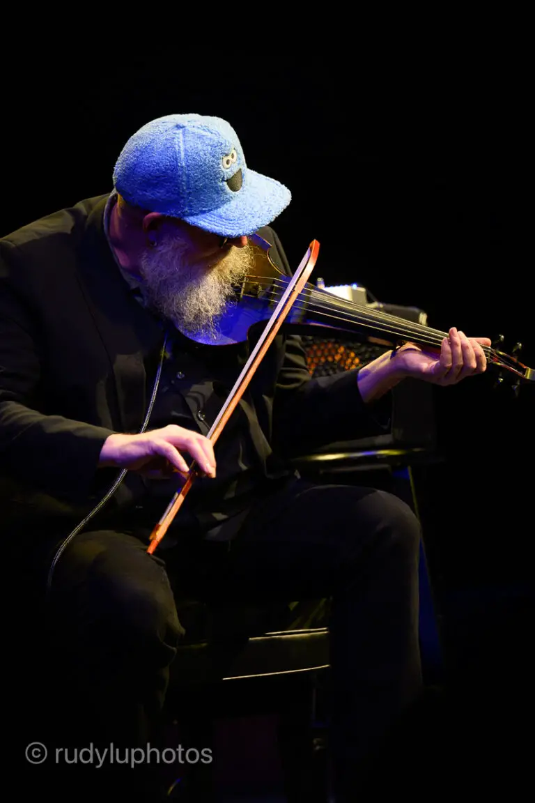 Mikael Marin (bearded) plays a bowed violincello de spalla (cello of the shoulder) and can use a separate one shaped more like an electric version pizzicato. He also played a smaller version of this instrument that functioned like a bass guitar. Both were amplified by a small bass amp in between them.